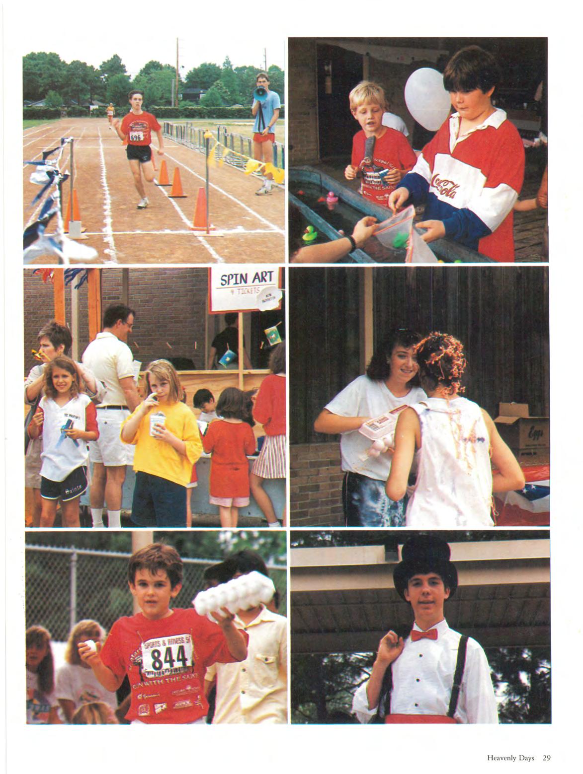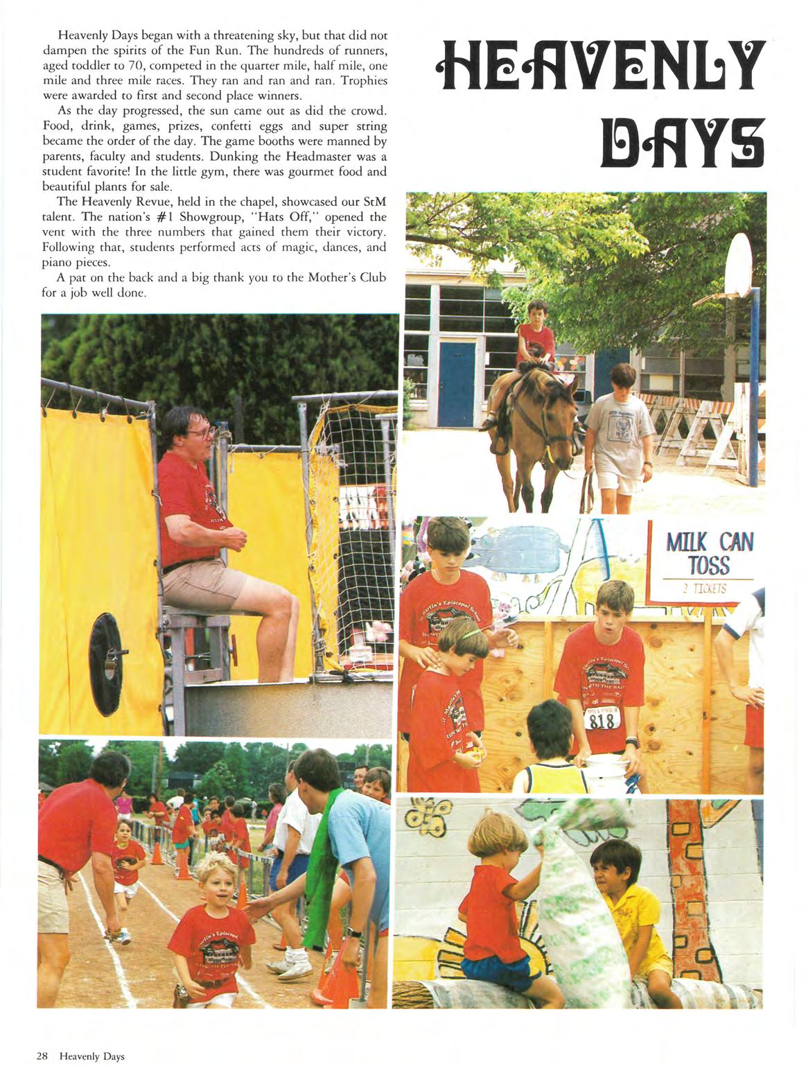 Heavenly Days began with a threatening sky, but chat did not dampen the spirits of the Fun Run. The hundreds of runners, aged coddler co 70, competed in the quarter mile, half mile, one mile and three mile races They ran and ran and ran. Trophies were awarded to first and second place winners.