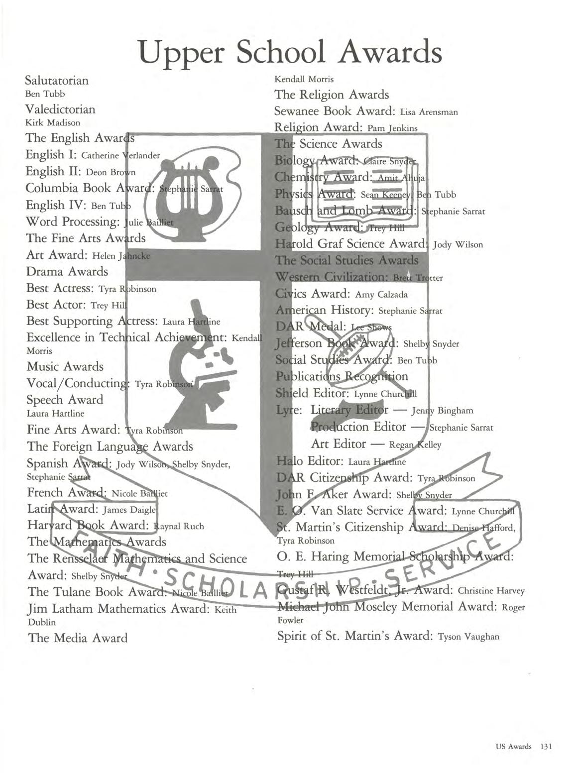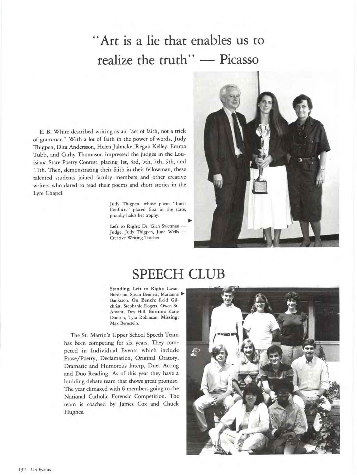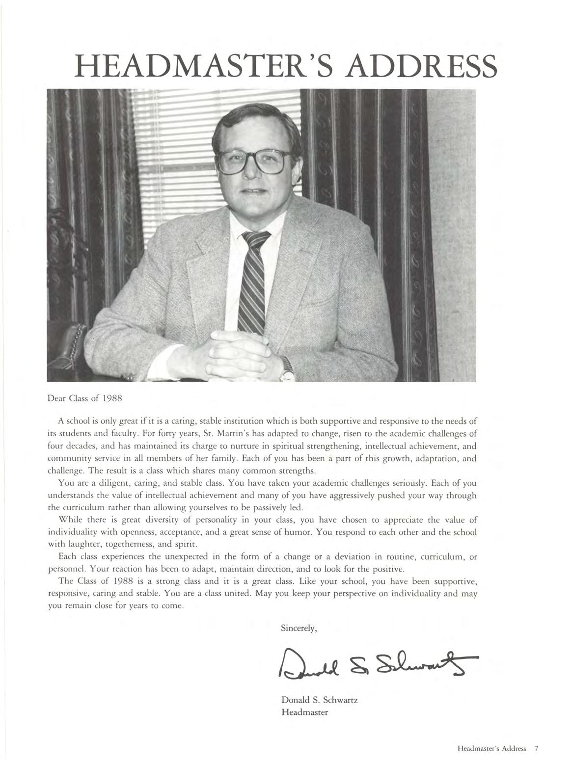 A school is only great if it is a caring, stable institution which is both supportive and responsive to the needs of its students and faculty For forty years, St. Martin ' s has adapted to change, risen to the academic challenges of four decades, and has maintained its charge to nurture in spiritual strengthening, intellectual achievement, and community service in all members of her family. Each of you has been a part of this growth, adaptation, and challenge The result is a class which shares many common strengths.