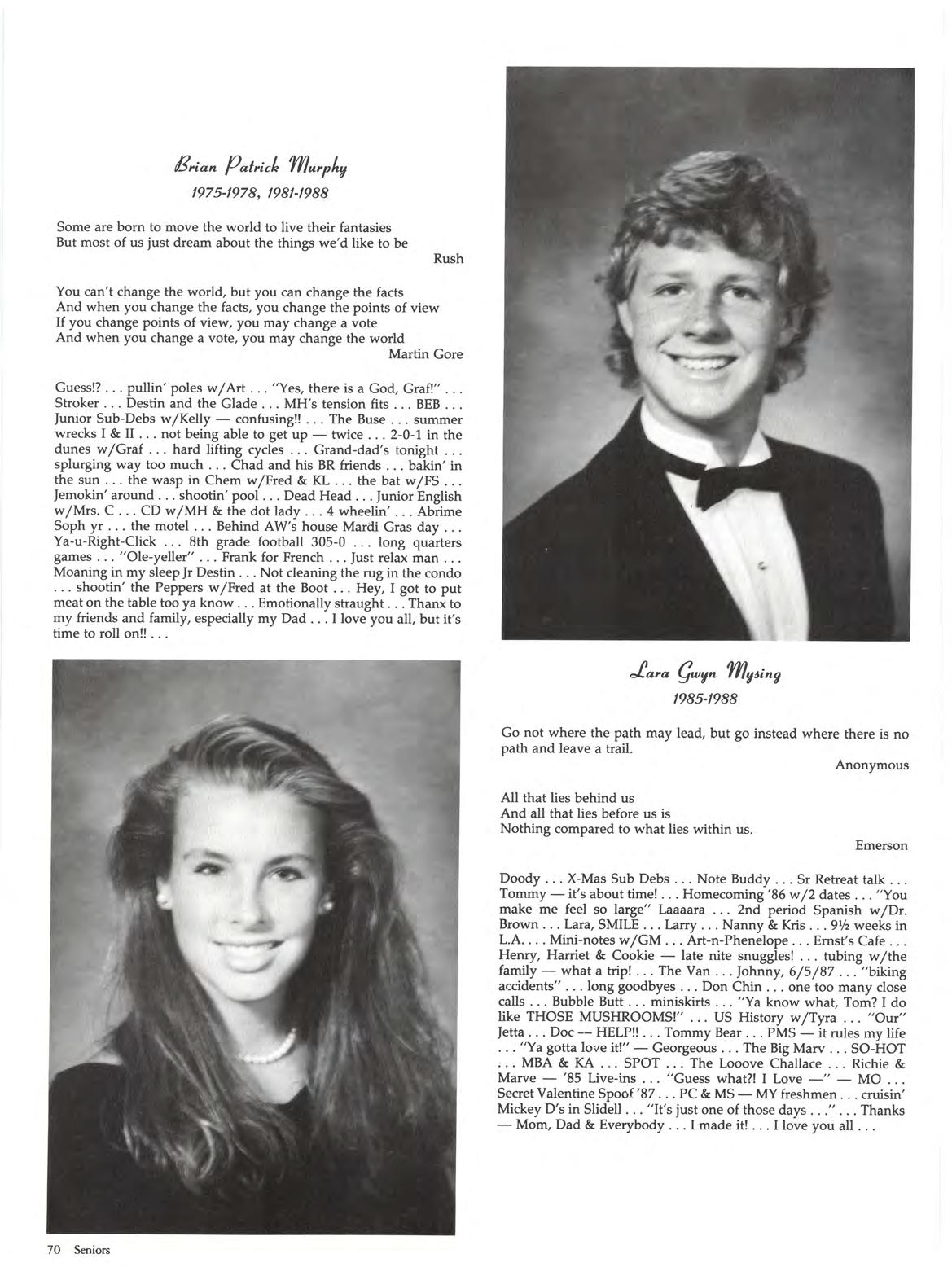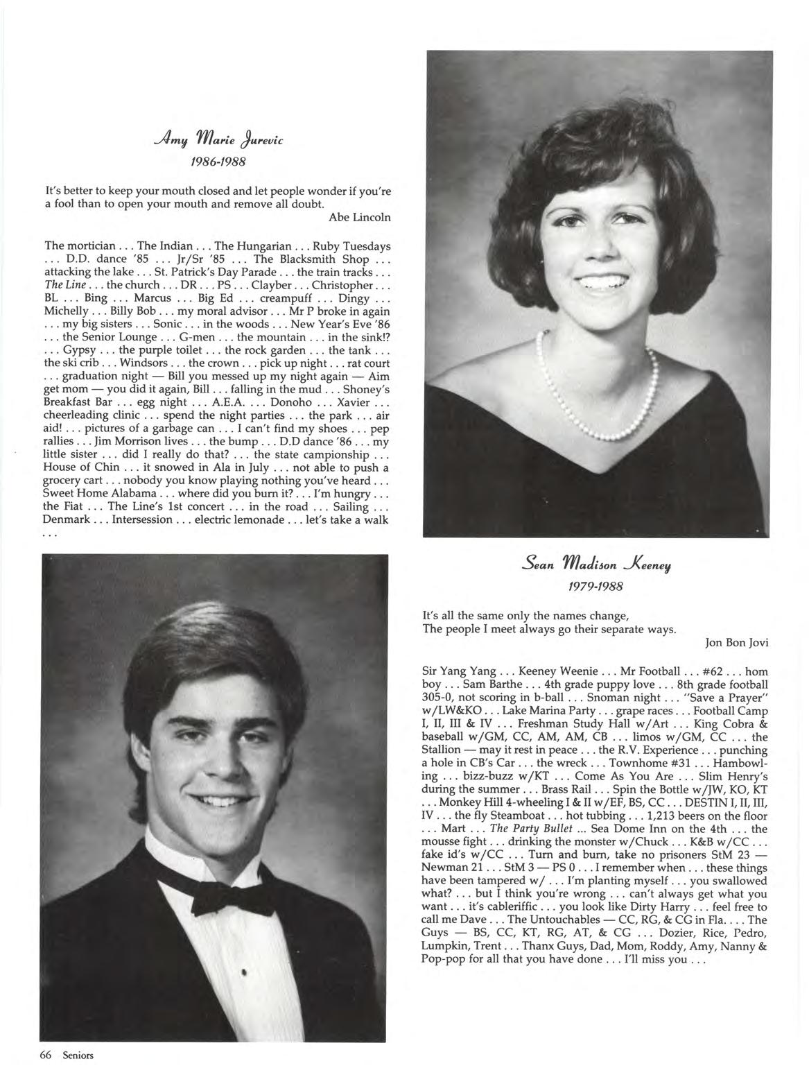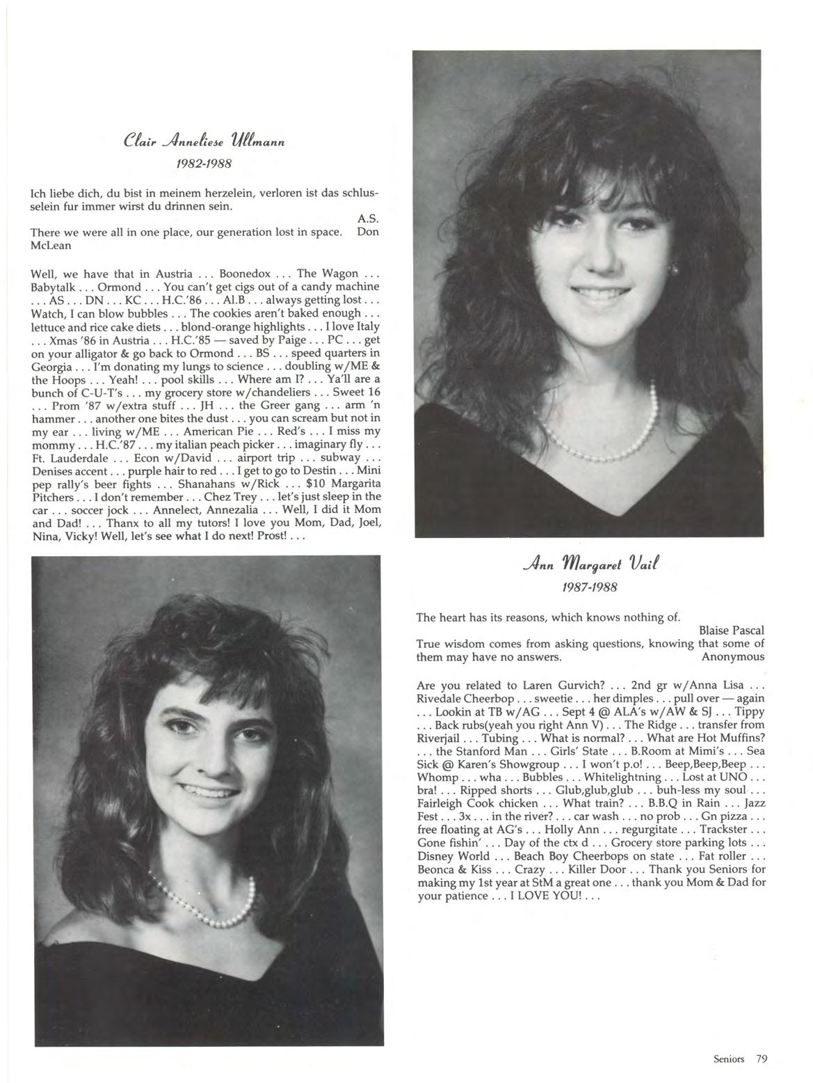 Emily Dickinson"Apple" Di-Anna "Anna-Anna-BobAnna" I never Sushi - he's so cute . .. " It's my house!" ... fights w /Q Parkway-Shannies Slumber Parties Eggrolls her laugh "charge it" Pool hustler The Flirt always getting Q in trouble ... Mow Mow .. . "You punched Flamm where! " .. . Destin, Fla - 84-88! Tuty Fruity T. Sister w / AG & EM " Way to go JUDE" Islander with Q Busted - Dad drank the OJ the Europe Guys those Jesuit boys confused long eyelashes "Hey, Baby" Sweet 16 '86 (date switch) Buster "who took my lucky?" Never say Never just cheese, meat, & bread tremendous The Beast "Tim babe - like the hat" Bizz Buzz - Anna can't do it Lance the Lifeguard how do you spell Smoyt? fuzzy naval shots Manhunts the lark allergies . .. The Ridge ... Camp Rainbow 86 & 87" Dan the Man!" ... Thank you Mom, Dad , Eddie , Kurt, Grandma & of course Sushi - I LOVE YOU ALL!!! To my friends, I wish you the best of luck - I'll never forget