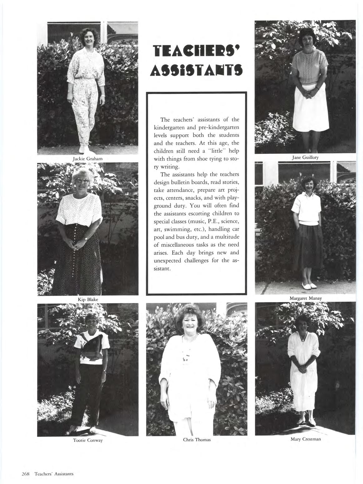 The teachers' assistants of the kindergarten and pre-kindergarten levels support both the students and the teachers. At this age, the children still need a "little" help with things from shoe tying to story wrmng.