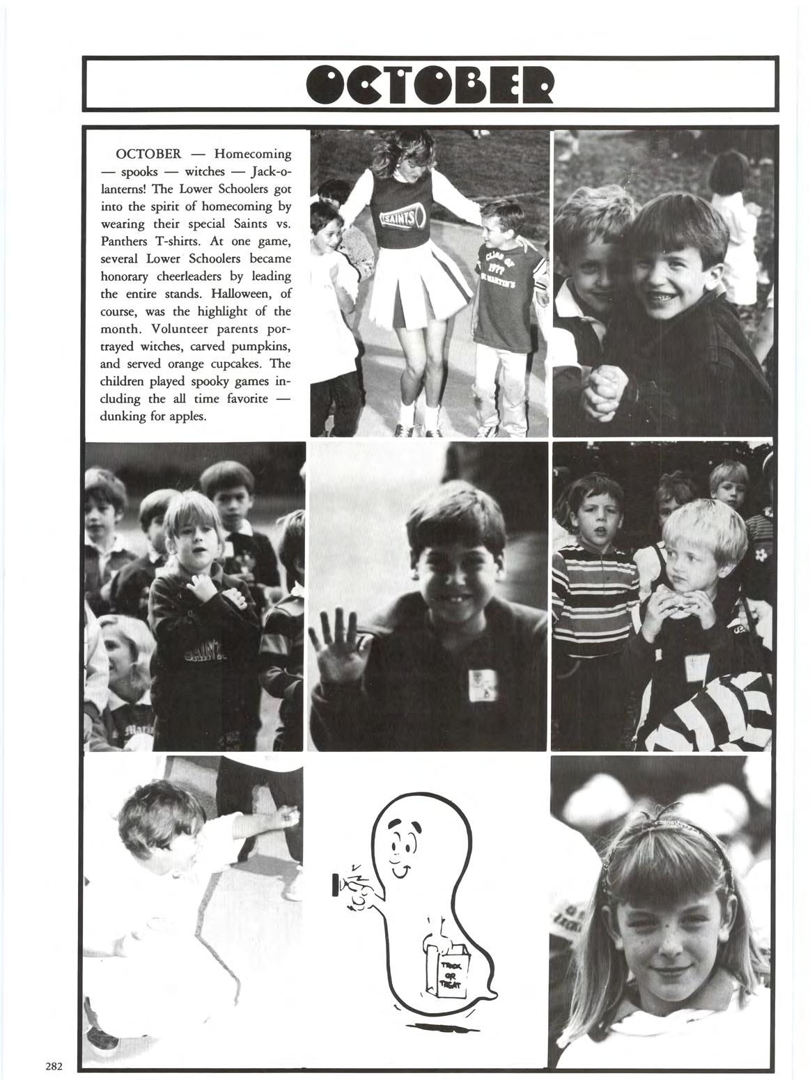 - spooks - witches - Jack-olantems! The Lower Schoolers got into the spirit of homecoming by wearing their special Saints vs. Panthers T-shirts At one game, several Lower · Schoolers became honorary cheerleaders by leading the entire stands. Halloween, of course, was the highlight of the month . Volunteer parents portrayed witches, carved pumpkins , and served orange cupcakes . The children played spooky games including the all time favoritedunking for apples