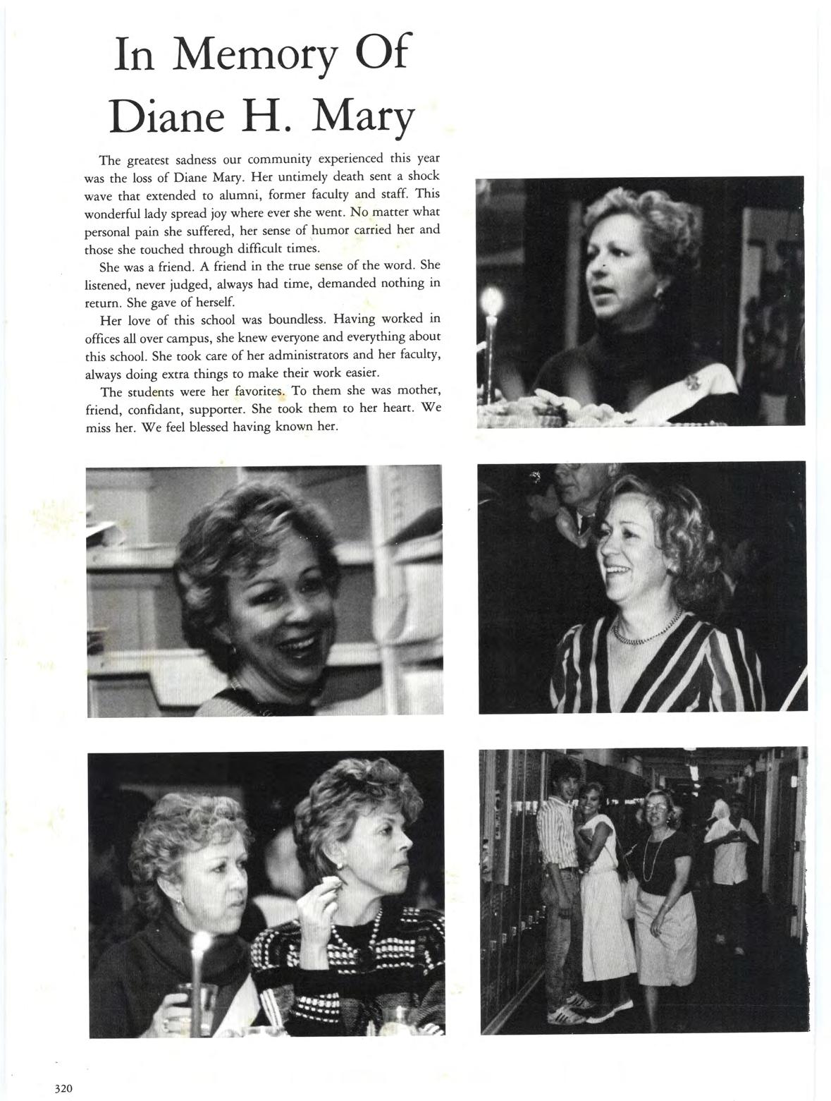 The greatest sadness our community experienced this year was the loss of Diane Mary. Her untimely death sent a shock wave that extended to alumni, former faculty and staff. This wonderful lady spread joy where ever she went. No matter what personal pain she suffered, her sense of humor carried her and those she touched through difficult times.