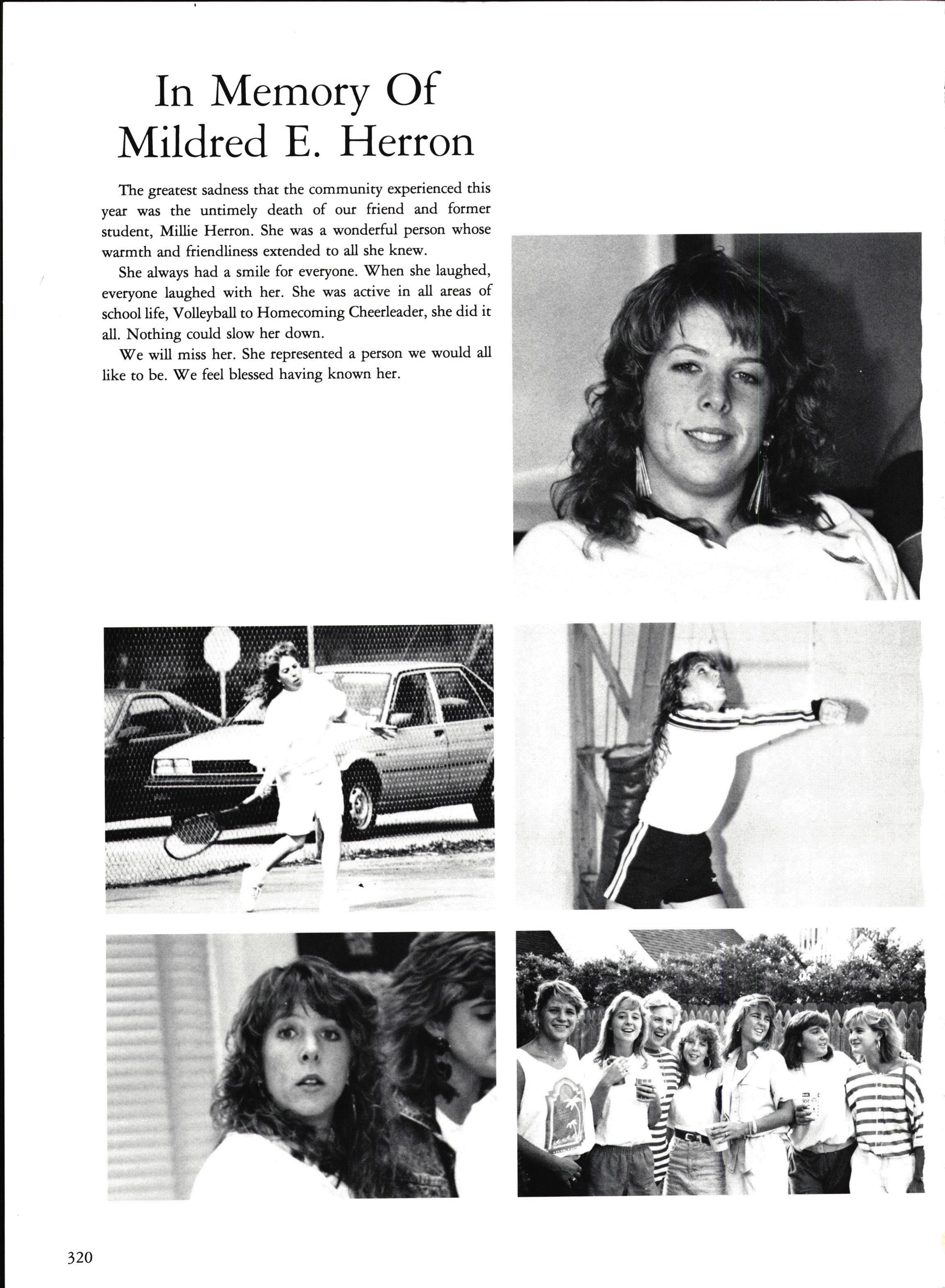 The greatest sadness that the communiry experienced this year was the untimely death of our friend and former student, Millie Herron. She was a wonderful person whose warmth and friendliness extended to all she knew.