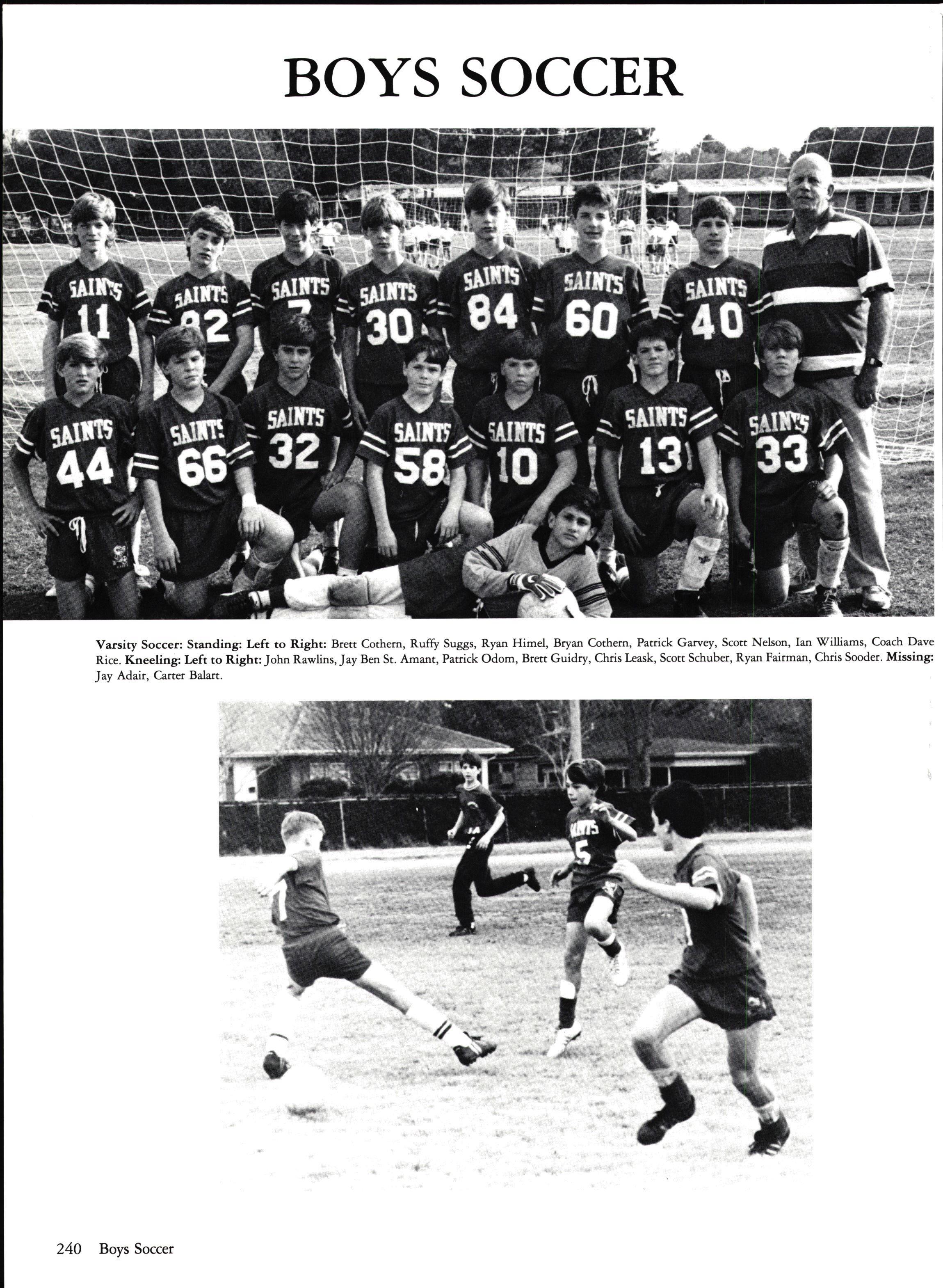 Varsiry Team: Top Row, Left to Right: Coach Farber, Hunter Horgan, Tim Ebercs, Chad Aleoan, Chris Stakelum, Jay Adair, Coach Dozier, Edmund Dieth, Bill Axelrad, Scott Barrm, Patrick Garey, Coach Hughs. Kneeling, Left to Right: Steven Griffth, Alex Messerli, Fritz Krh, Byran Cothern, Patrick Odom, Carter Marsha.l, Bailey Taylor, Greg Page. Sitting, Left to Right: Brett Cotheo, Chris Coffmao, Ruf$ Suggs, Jonarhan Shumack, Jay Ben St. Amant, Scott Schuber, Im Villiams, Sruan Peyton.
