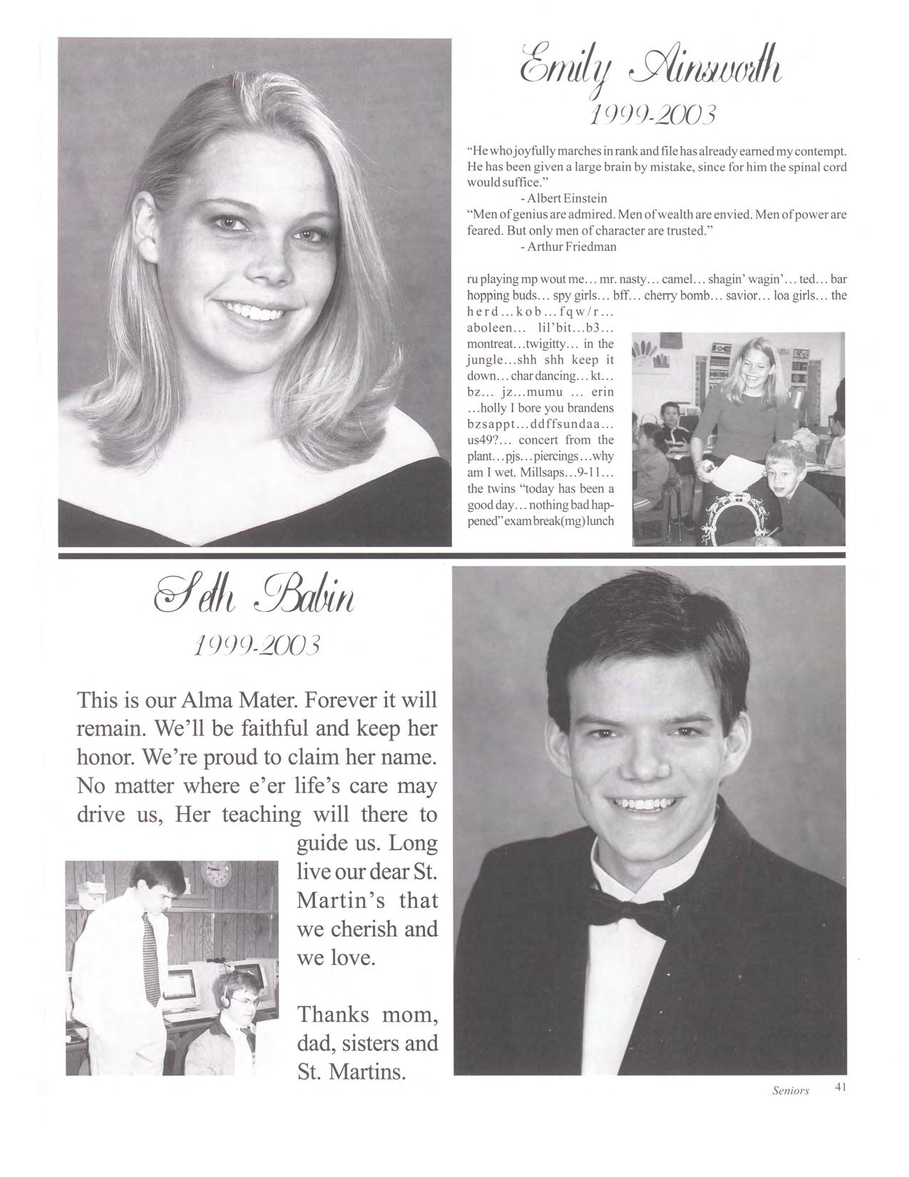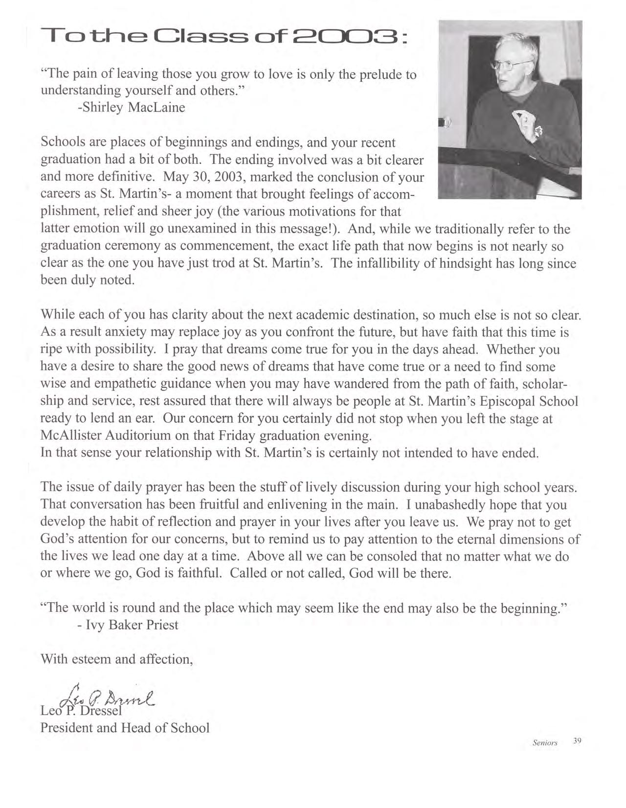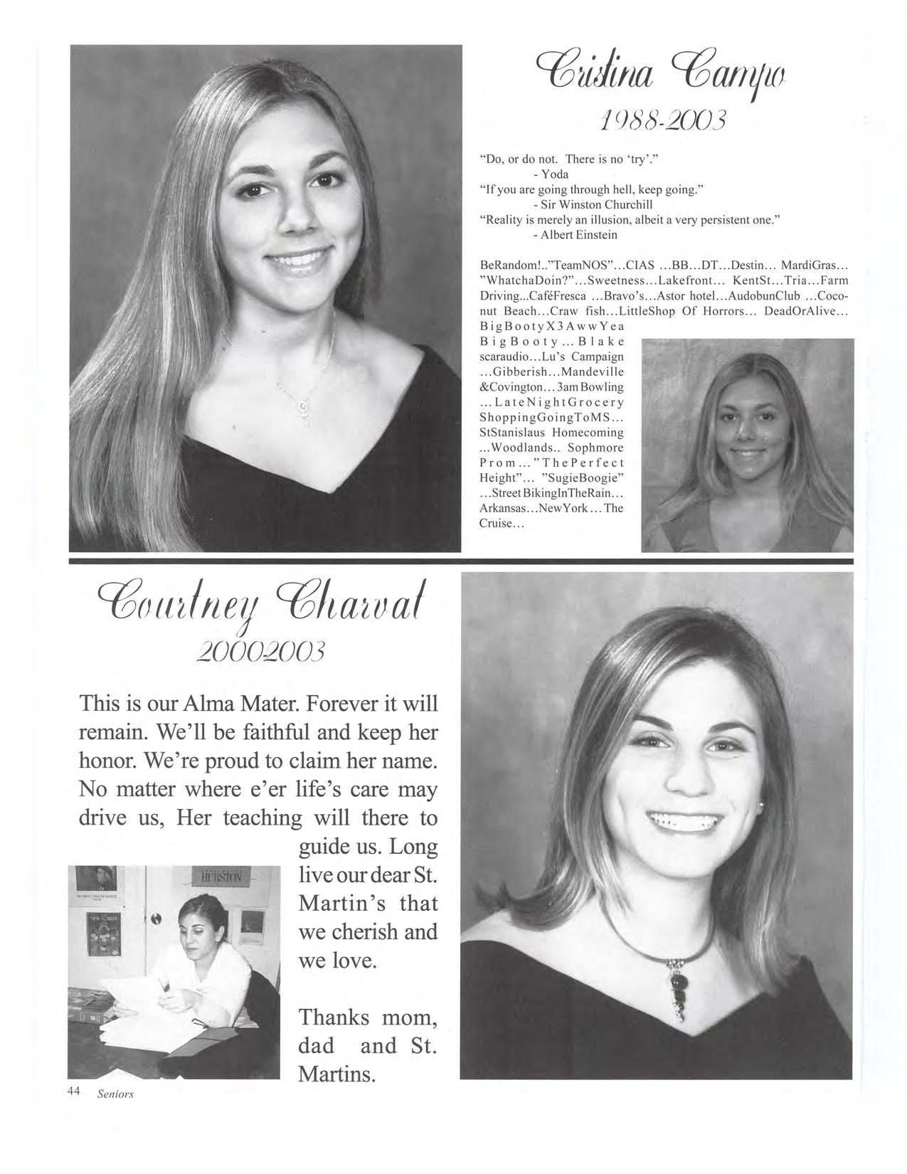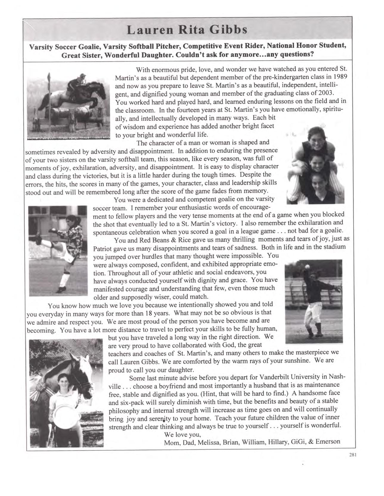 With enormous pride, love, and wonder we have watched as you entered St. Martin's as a beautiful but dependent member of the pre-kindergarten class in 1989 and now as you prepare to leave St. Martin's as a beautiful, independent, intelligent, and dignified young woman and member of the graduating class of 2003.