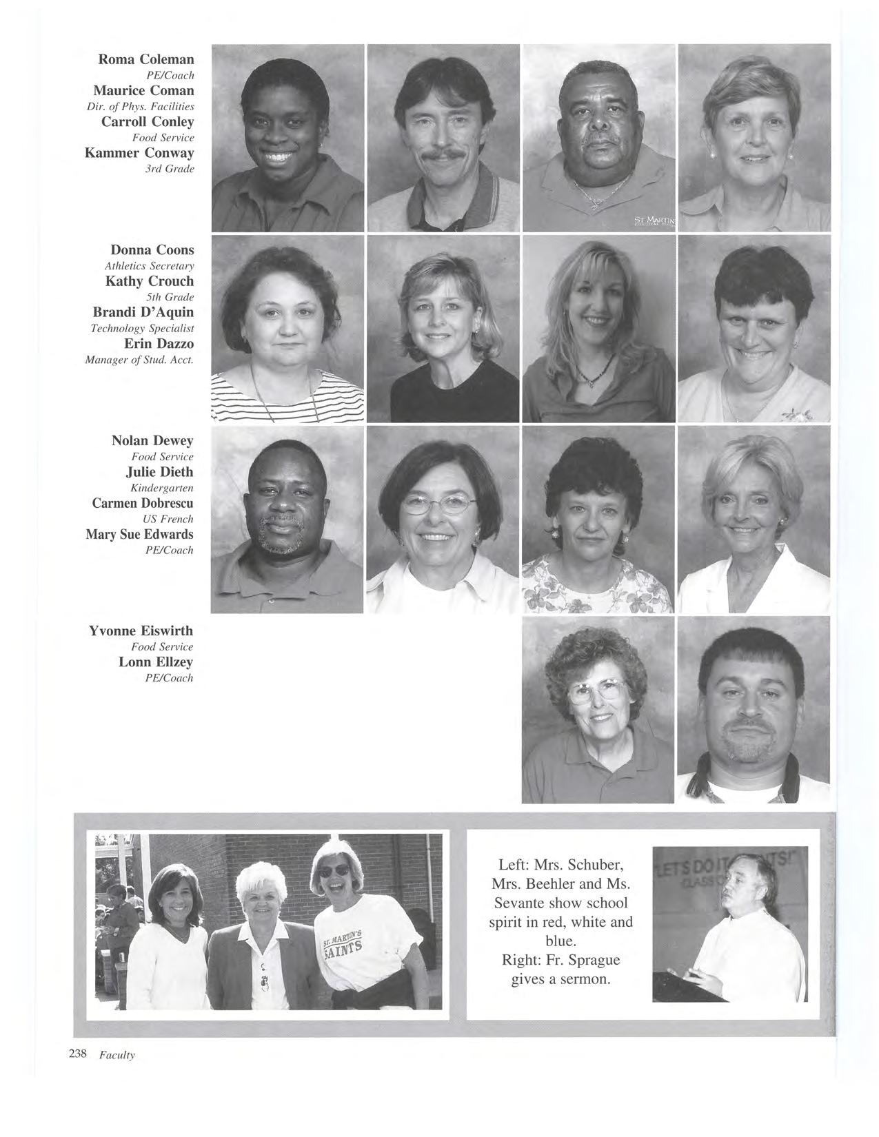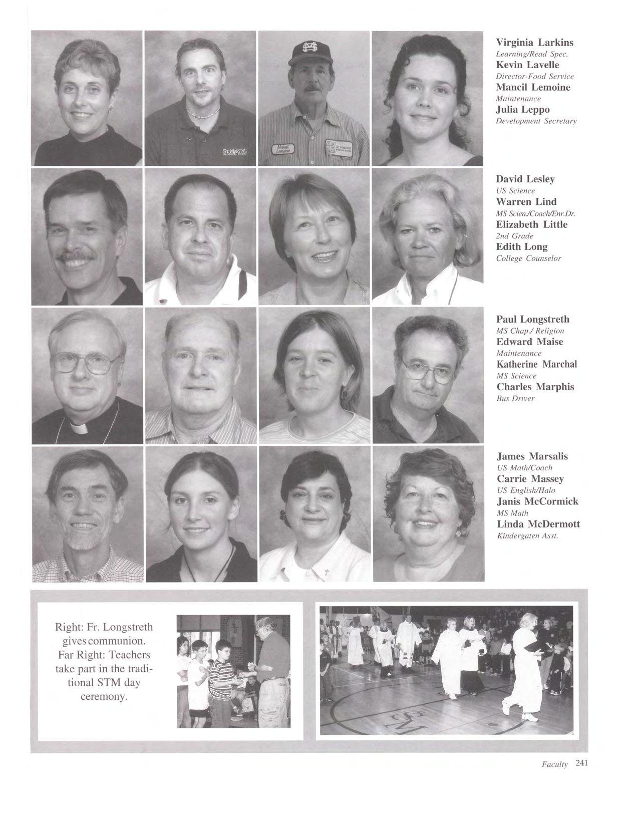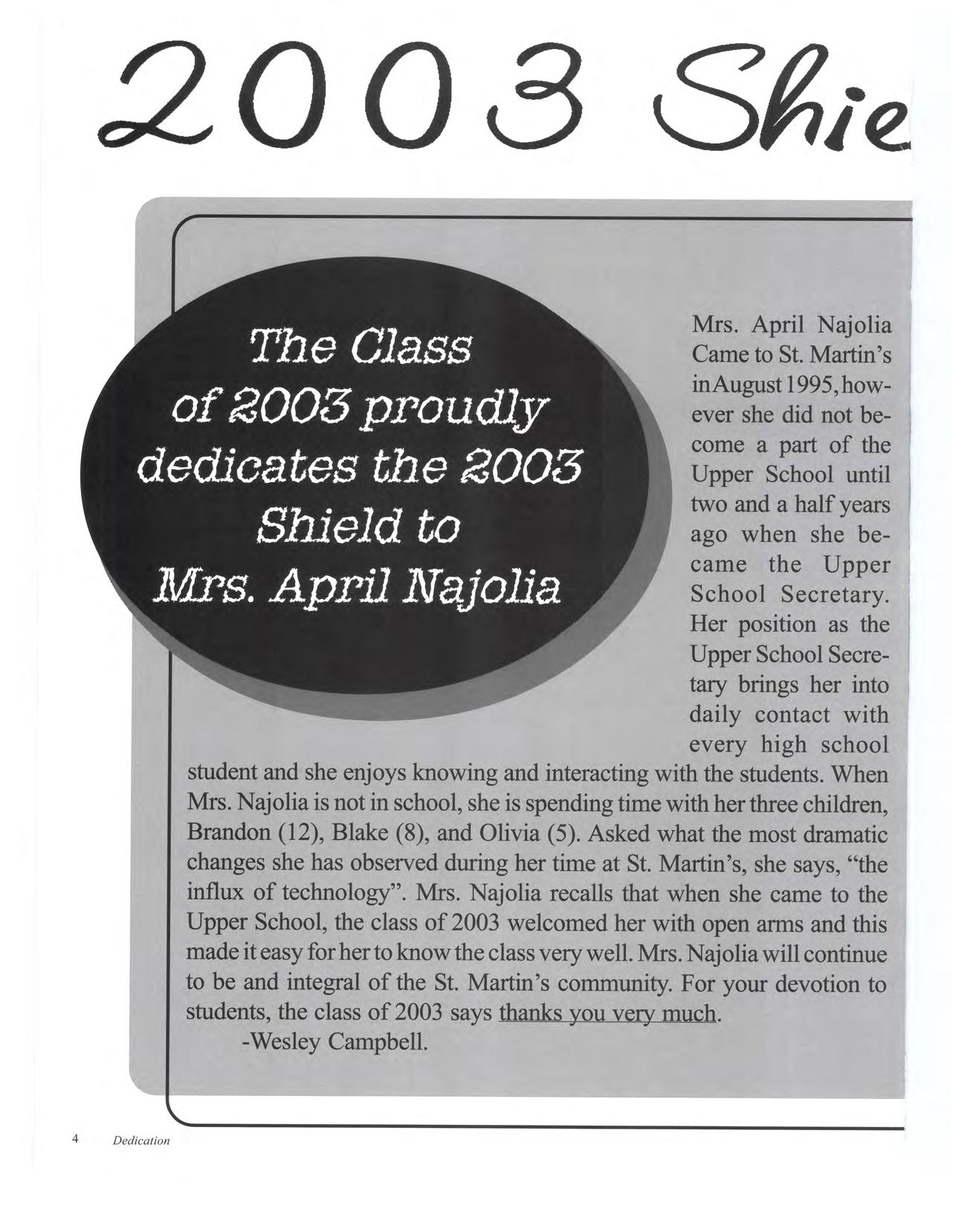 Came to St. Martin's inAugust 1995, however she did not become a part of the Upper School until two and a half years ago when she became the Upper School Secretary. Her position as the Upper School Secretary brings her into daily contact with every high school student and she enjoys knowing and interacting with the students. When Mrs. Najolia is not in school, she is spending time with her three children, Brandon (12), Blake (8), and Olivia (5). Asked what the most dramatic changes she has observed during her time at St. Martin's, she says, "the influx of technology". Mrs. Najolia recalls that when she came to the Upper School, the class of 2003 welcomed her with open arms and this made it easy for her to know the class very well. Mrs. Najolia will continue to be and integral of the St. Martin's community. For your devotion to students, the class of 2003 says thanks you very much.