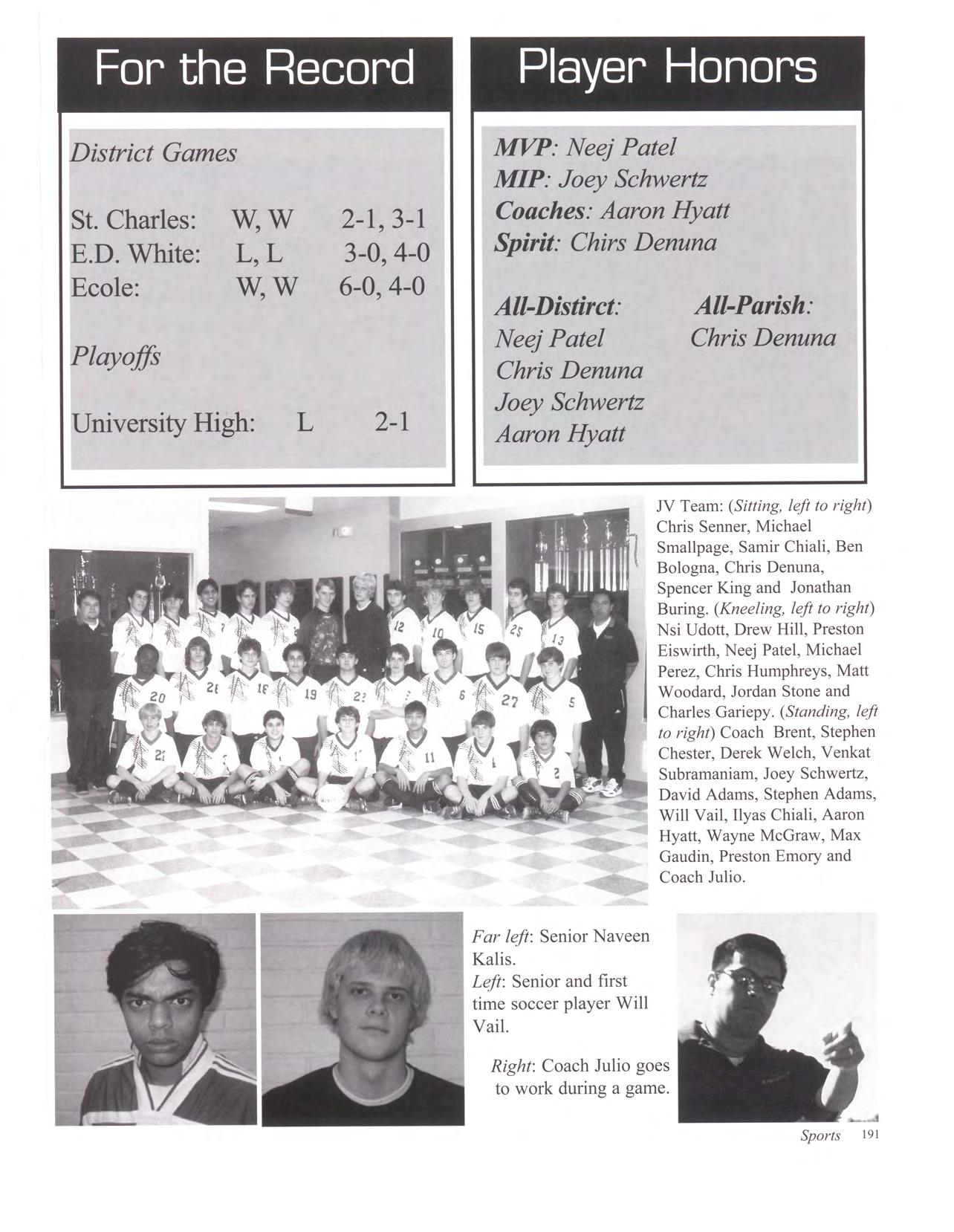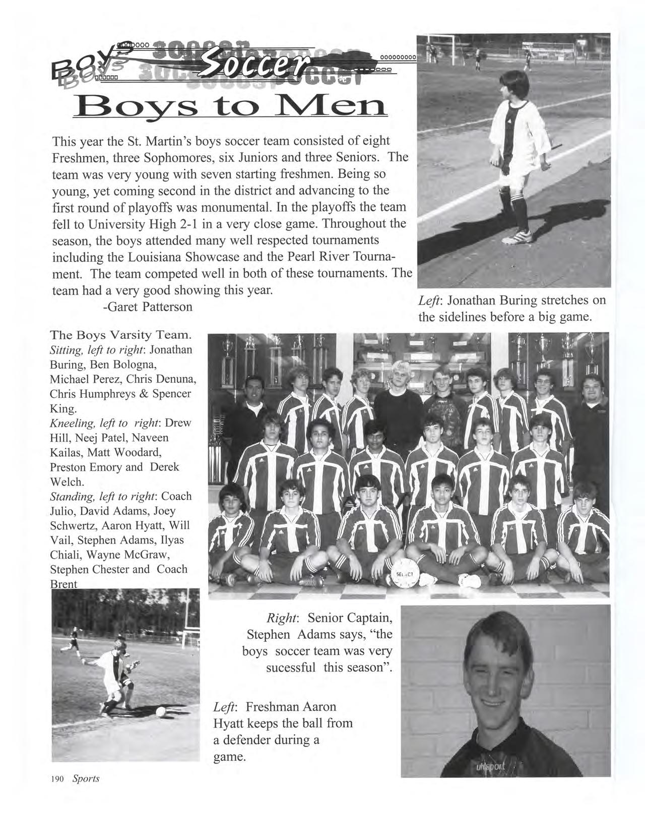 You were a dedicated and competent goalie on the varsity soccer team. I remember your enthusiastic words of encouragement to fellow players and the very tense moments at the end of a game when you blocked the shot that eventually led to a St. Martin's victory. I also remember the exhilaration and spontaneous celebration when you scored a goal in a league game ... not bad for a goalie.