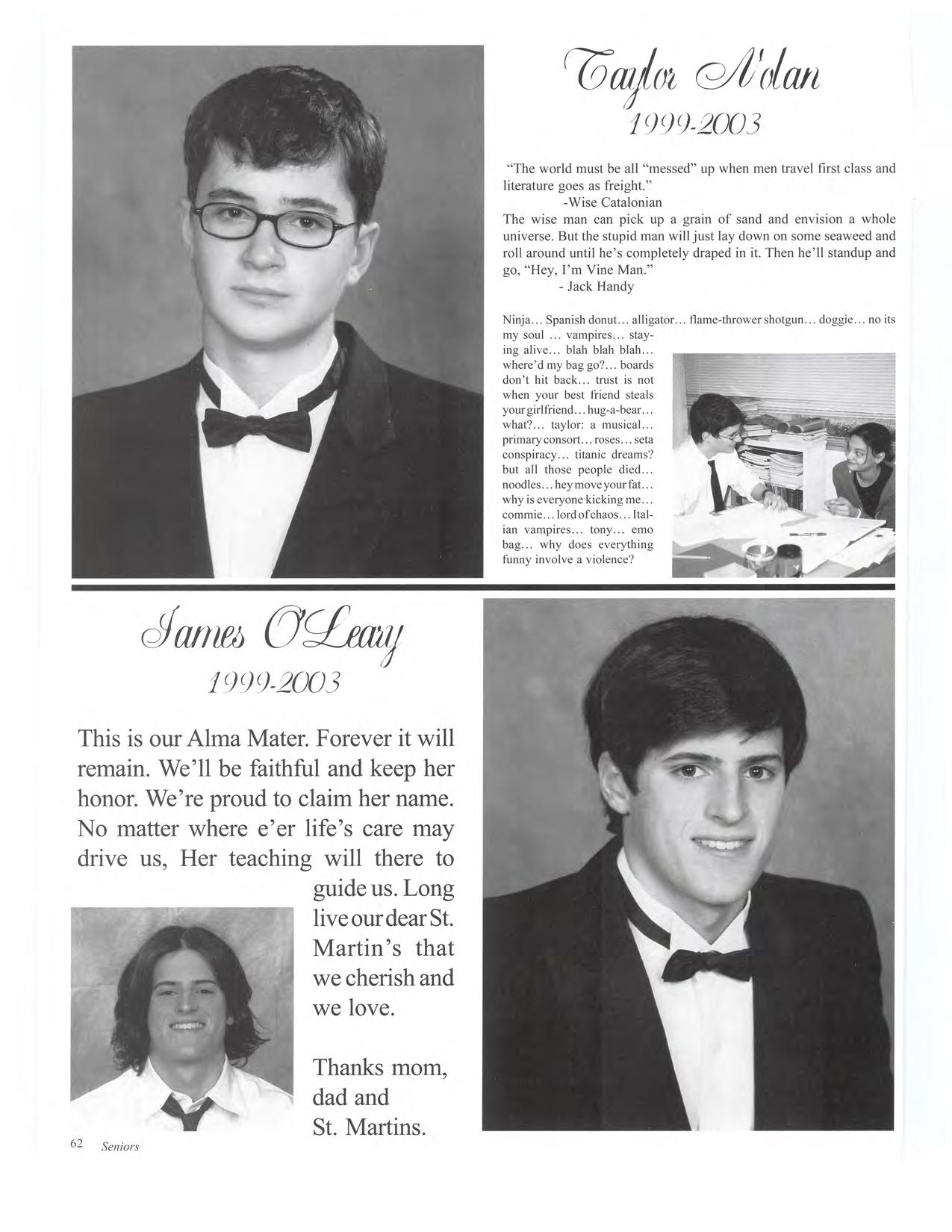 From the moment you were born. we knew you were bright. determined, talented and adorable. In the 12 years at St. Martin's, you have become smarter. focused. ingenious and have grown into a handsome young man. Just remember to follow your vision, wherever it will lead. We are so PROU[) of youlll