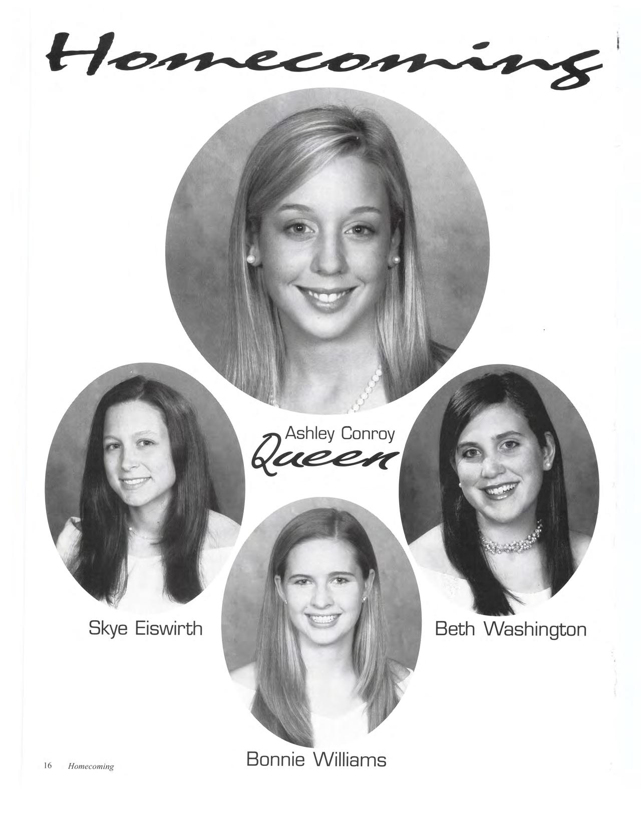 Below: Homecoming Court members Ashley Riso, Hayley Hutchison, Ashley Conroy, Bonnie Williams, Beth Washington, Skye Eiswirth, Jessica White , Brooke Conroy, Elise Bordson-Bozzo and Kelsey Vogt.
