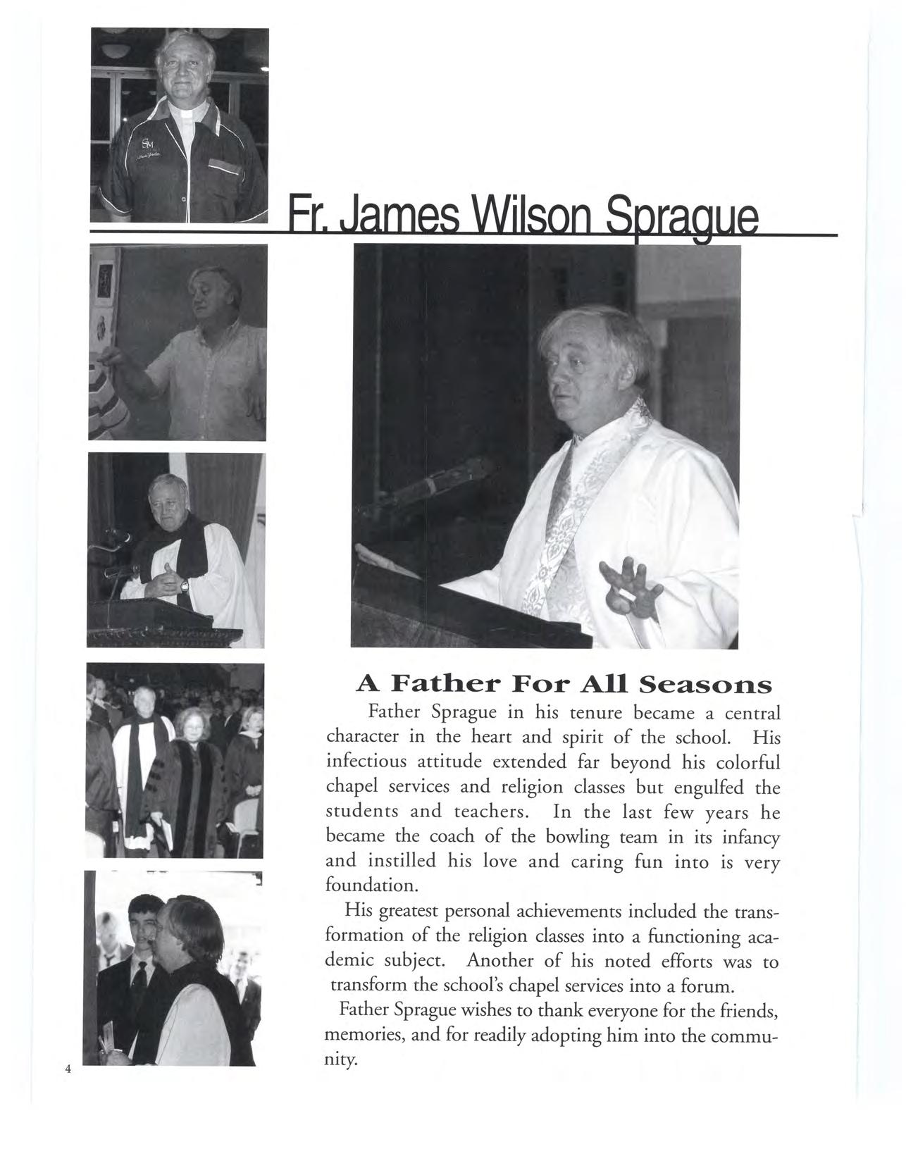 Father Sprague in his tenure became a central character in the heart and spirit of the school. His infectious attitude extended far beyond his colorful chapel services and religion classes but engulfed the students and teachers. In the last few years he became the coach of the bowling team in its infancy and instilled his love and caring fun into is very foundation.