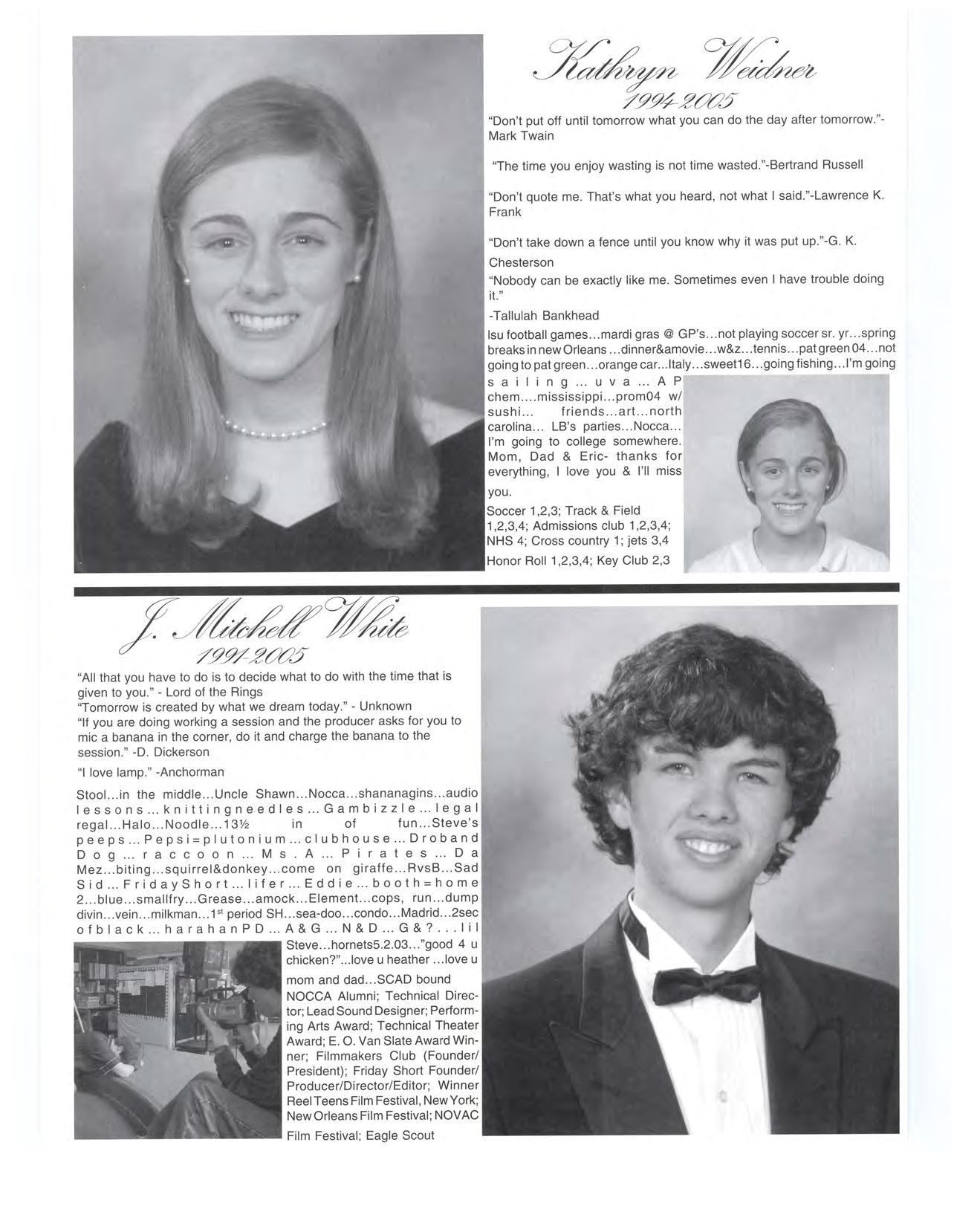 With enormous pride , love , and wonder we have watched as you entered St. Martin's as a beautiful but dependent member of the prekindergarten class in 1990 and now as you leave St. Martin's as a beautiful , independent, intelligent, and dignified young woman and member of the graduating class of 2005 You worked hard , played hard , and learned enduring lessons on the field , on the stage , and in the classroom. In the fourteen years at St. Martin's you have emotionally , spiritually, and intellectually developed in many ways. Each bit of wisdom and experience has added another bright facet to your bright and wonderful life .