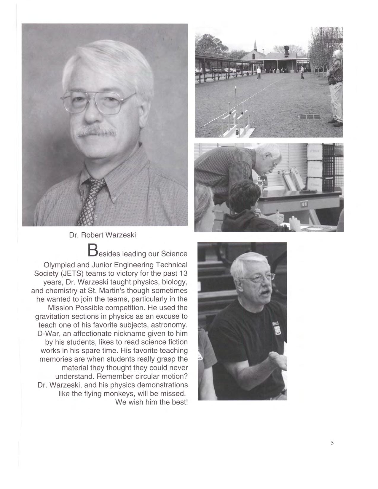 Besides leading our Science Olympiad and Junior Engineering Technical Society (JETS) teams to victory for the past 13 years, Dr Warzeski taught physics, biology, and chemistry at St. Martin's though sometimes he wanted to join the teams, particularly in the Mission Possible competition. He used the gravitation sections in physics as an excuse to teach one of his favorite subjects, astronomy. D-War, an affectionate nickname given to him by his students, likes to read science fiction works in his spare time. His favorite teaching memories are when students really grasp the material they thought they could never understand. Remember circular motion? Dr. Warzeski, and his physics demonstrations like the flying monkeys, will be missed. We wish him the best!
