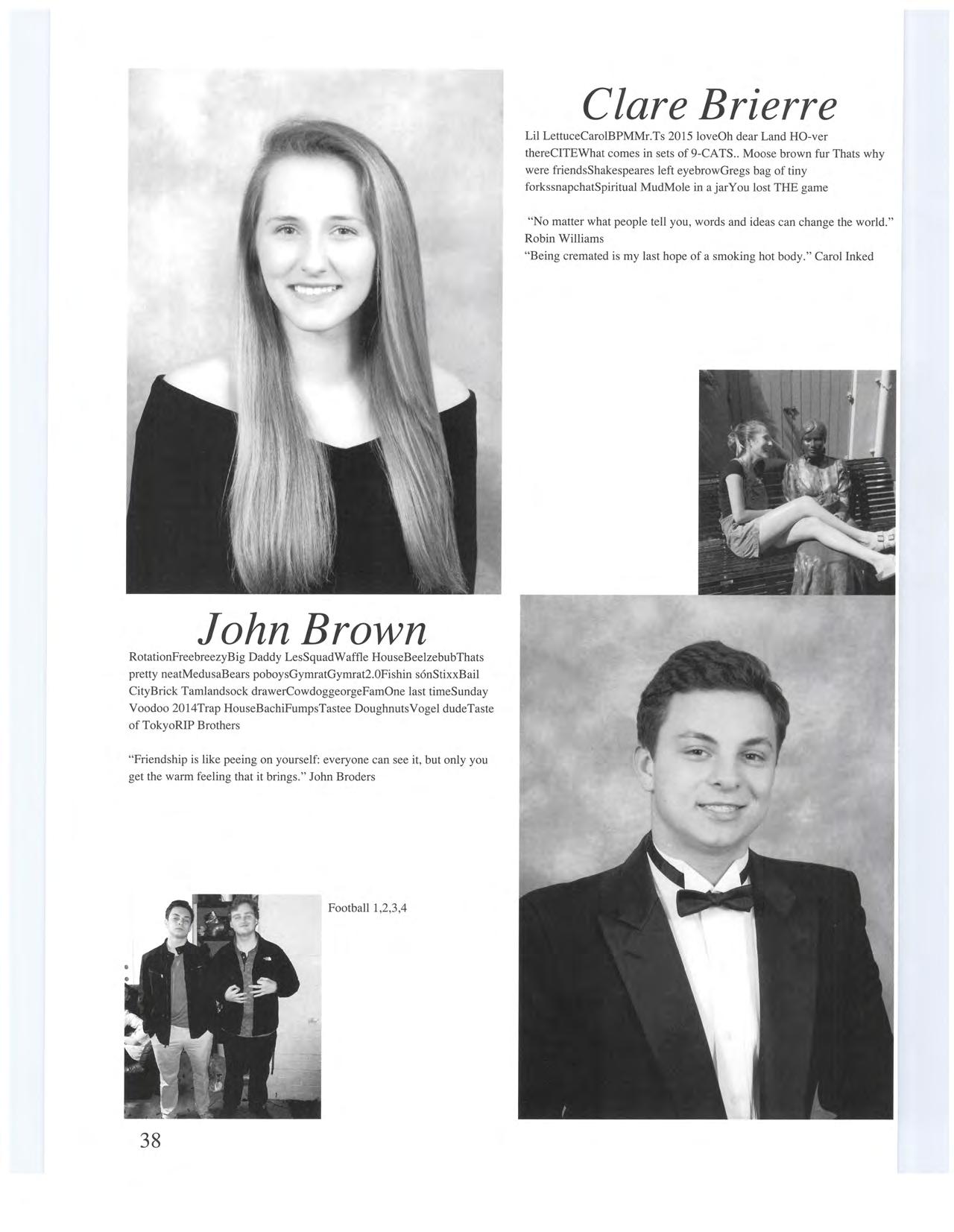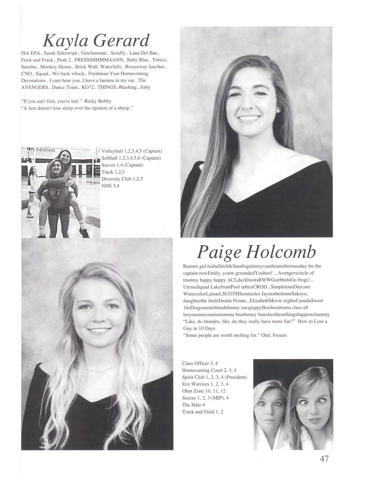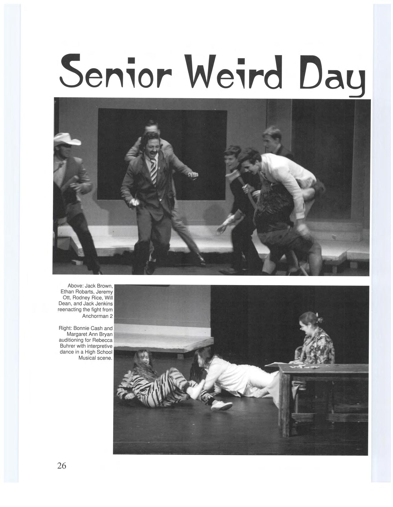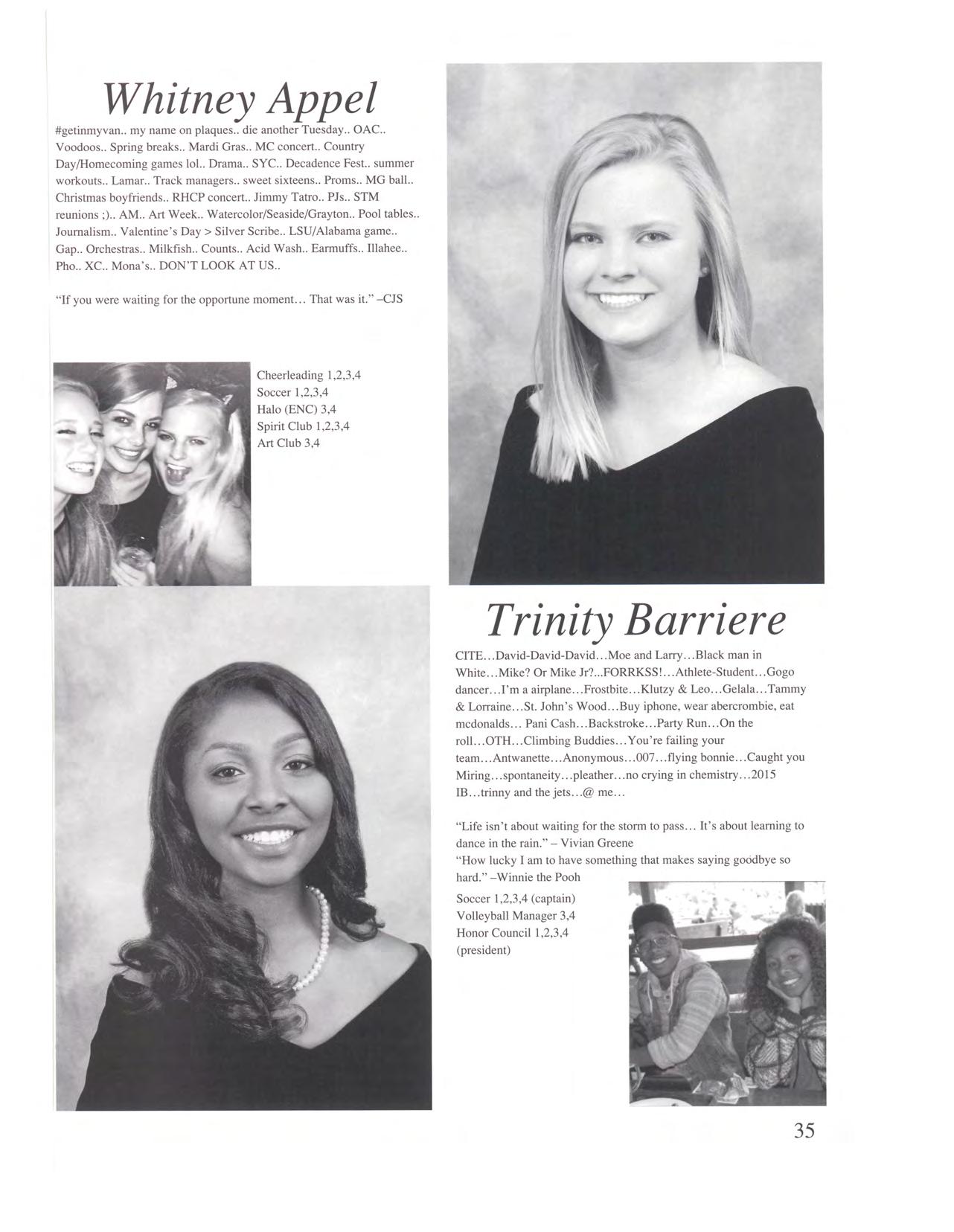 Fresh: Cheer w/ SG & DB, don't go to CS findin KB in a cave w/ D da V Squad begins SB r you a v? Rick's d's at pjs Soph: so many new ppl joes n cuties play all day VDay party at KBs CanadaApples Junior: badkidsallintakenola MidS MG w/ KB SW <loin M .. lazy daze w/ the crew .... srsly Buku w/ Dorris ha .. bust'it..snowed in spring/summer w/ SKgang Senior: still actin like a kid me agnst the world evryear voodoobukubreaksRablurr Friends: shoutout KB MM