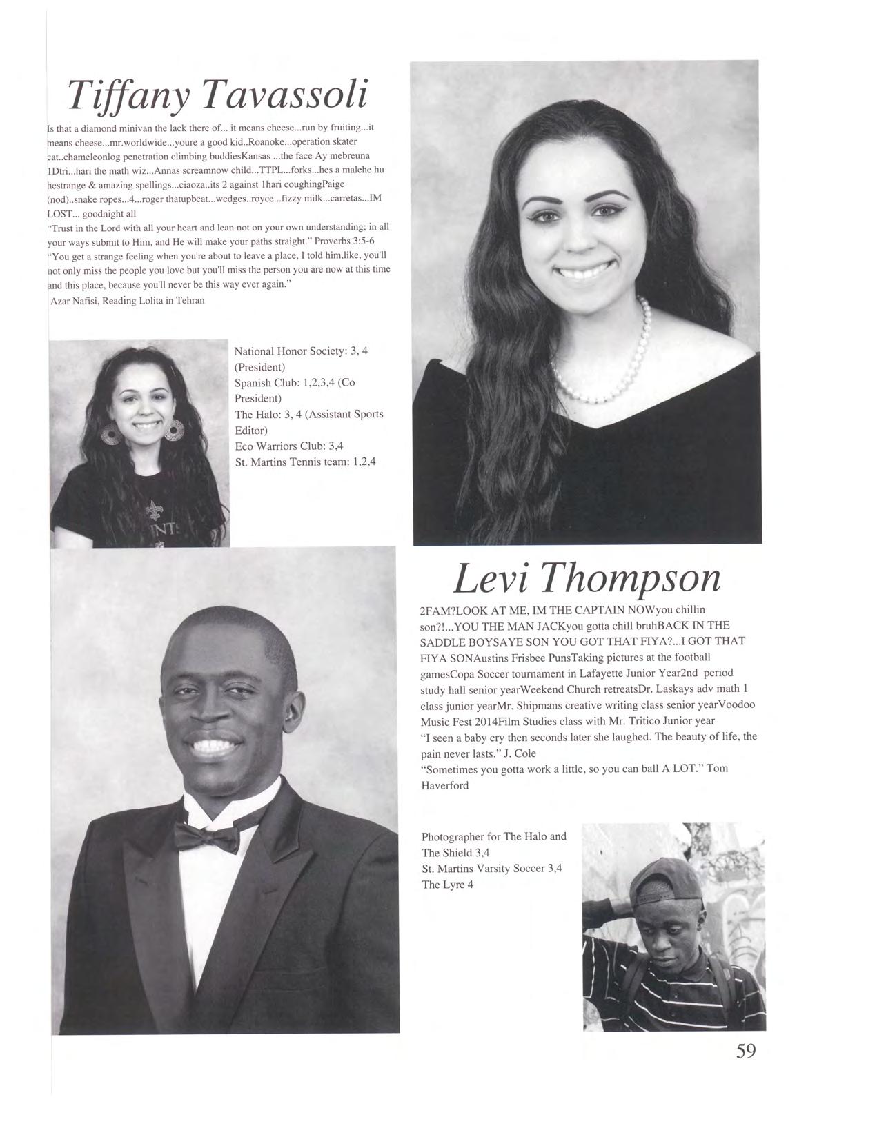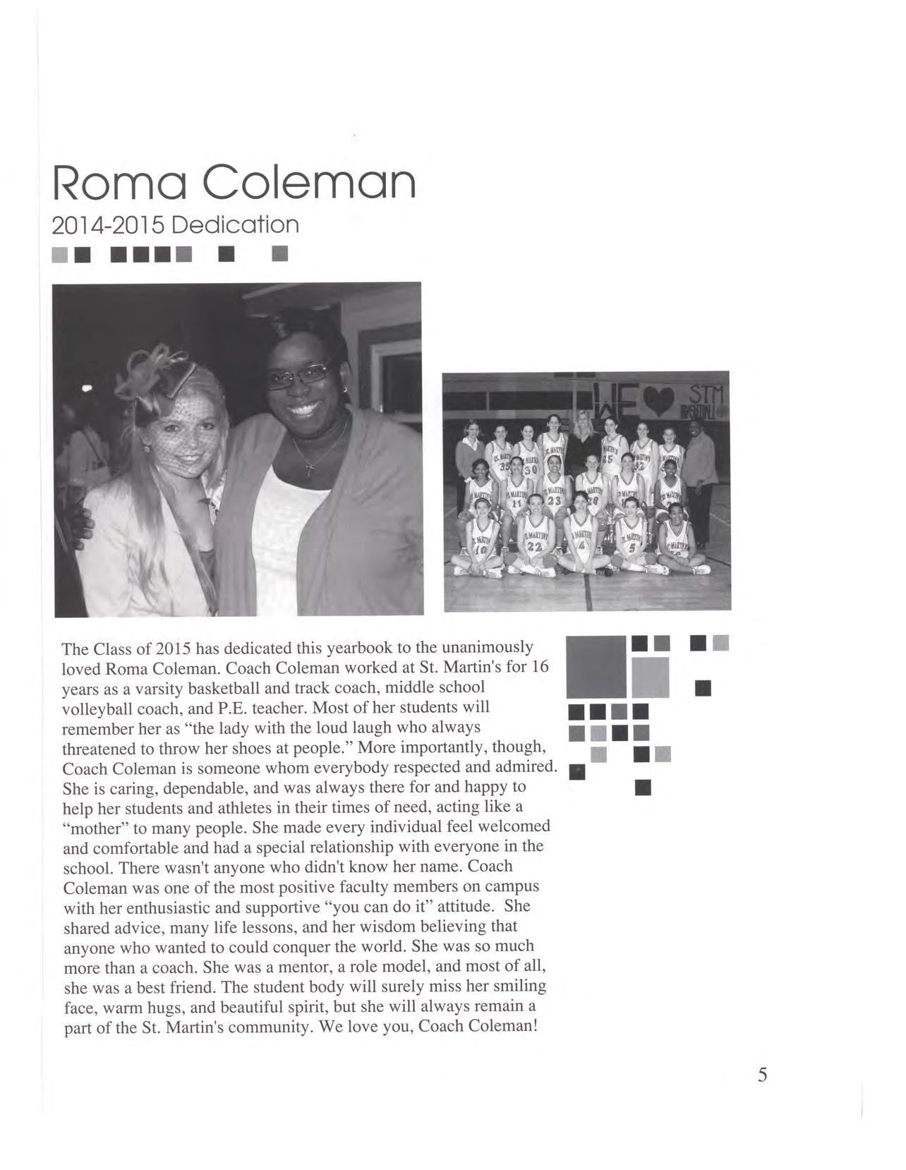 The Class of 2015 has dedicated this yearbook to the unanimously loved Roma Coleman. Coach Coleman worked at St. Martin's for 16 years as a varsity basketball and track coach, middle school volleyball coach, and P.E. teacher. Most of her students will remember her as "the lady with the loud laugh who always threatened to throw her shoes at people." More importantly, though, Coach Coleman is someone whom everybody respected and admired. She is caring, dependable, and was always there for and happy to help her students and athletes in their times of need, acting like a "mother" to many people. She made every individual feel welcomed and comfortable and had a special relationship with everyone in the school. There wasn't anyone who didn't know her name. Coach Coleman was one of the most positive faculty members on campus with her enthusiastic and supportive "you can do it" attitude. She shared advice, many life lessons, and her wisdom believing that anyone who wanted to could conquer the world. She was so much more than a coach. She was a mentor, a role model, and most of all, she was a best friend. The student body will surely miss her smiling face, warm hugs, and beautiful spirit, but she will always remain a part of the St. Martin's community. We love you, Coach Coleman!