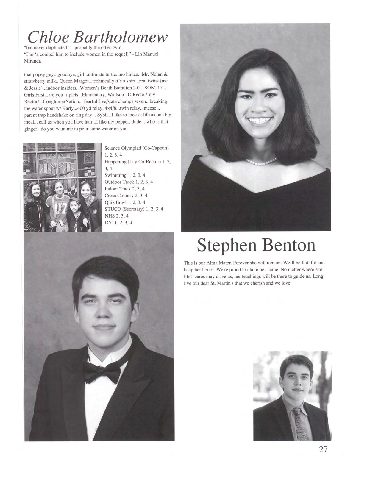 This is our Alma Mater. Forever she will remain . We ' ll be faithful and keep her honor. We're proud to claim her name. No matter where e're life's cares may drive us , her teachings will be there to guide us. Long live our dear St. Martin's that we cherish and we love