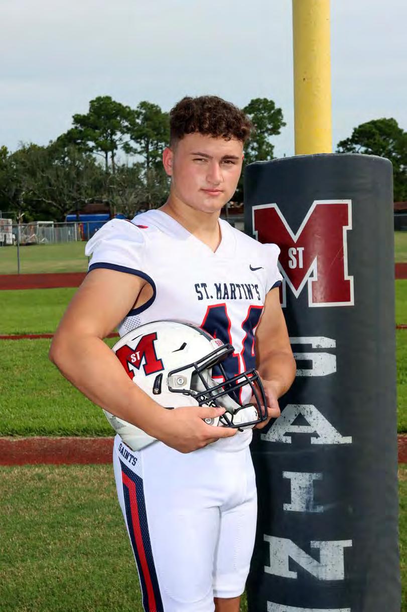 18 VARSITY FOOTBALL Varsity Football Head Coach Frank Gendusa Assistant Coaches Jordan Hill, Don Klos, Bradley Farris, Kevin Dizer, Bobby Ledoux Trainer Destini Manuel # NAME YEAR HT WT POSITION 1 Chris Profit Junior 5’11” 145 DB/WR 2 Seth Mandella Senior 5’10” 165 DB/RB 3 Kain Oddo Freshman 5’6” 120 RB/LB 4 Ashton Oliver Sophomore 5’8” 145 QB/WR 5 Matthew Mannino Senior 6’0” 165 QB/WR/DB/P 6 Tyler Penny Freshman 5’6” 115 RB/DB 7 Myles Baker Freshman 5’6” 120 WR/DB 8 Grant Heytens Freshman 5’8” 117 WR/DB 10* Garrett DeViney Senior 6’0” 193 DE/LB 11 Daken Baker Junior 6’2” 181 WR/DB 12 Thompson Becnel Sophomore 6’1” 160 WR/DB 14 Dublin Hoerner Freshman 5’1” 80 WR/DB 15 August Schmedtje Senior 5’9” 130 WR/DB 17 Harrison Kurt Sophomore 5’10” 127 WR/DB 18 Brody Egan Freshman 5’5” 120 RB/DB 19 Daniel Schexnaildre Senior 6’0” 180 WR/DB # NAME YEAR HT WT POSITION 20 Conner Nicoladis Senior 5’11” 145 WR/DB 22 Cooper Helmke Sophomore 6’0” 140 WR/DB/K 24 Noah Dunn Freshman 5’8” 147 RB/LB 25 Harlem Berry Sophomore 6’0” 165 RB/DB 27 Grant Gendusa Senior 6’3” 220 TE/LB 44 Timothy Roberts Senior 6’1” 194 DE/TE 53 Dominic Hogan Junior 5’11” 205 OL/DL 54 Zack Kelly Sophomore 6’1” 265 OL/DL 55 Dylan Raines Junior 6’0” 225 OL/DL 56 Courtade Carrere Junior 5’8” 163 OL/DL 58 Manny Bejaran Junior 6’1” 228 OL/DL 60 Ricky Pickens Senior 5’10” 245 OL/DL 62 Aidan Molaison Freshman 5’11” 190 OL/DL 64 Dimitri Rice Junior 5’10” 195 OL/DL 66 Jacob Hill Freshman 6’4” 184 OL/DL 72 Daniel Fink Sophomore 6’2” 290 OL/DL CONGRATULATIONS! #19 Daniel Schexnaildre, #60 Ricky Pickens, #5 Matt Mannino, #10 Garrett Deviney, #27 Grant Gendusa, #2 Seth Mandella, #20 Conner Nicoladis, #15 August Schmedtje, and #44 Timmy Roberts FOOTBALL SENIORS THE ONLY THING TOUGHER THAN A FOOTBALL PLAYER IS HIS LITTLE SISTER Good luck this year Matt and Gabby! Class of 2023 & Class of 2024 Love, Mom, Dad, and Joseph * Garrett DeViney now #50 19