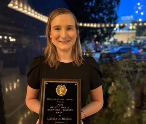 Laura Higbee was named one of two Legal Aid of East Tennessee's Volunteer Lawyer of the Year. Laura works with clients in commercial litigation and class action disputes. She has been heavily involved in pro bono work and has been a presence in Legal Aid clinics over the past two years.