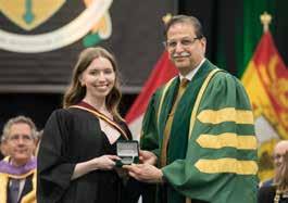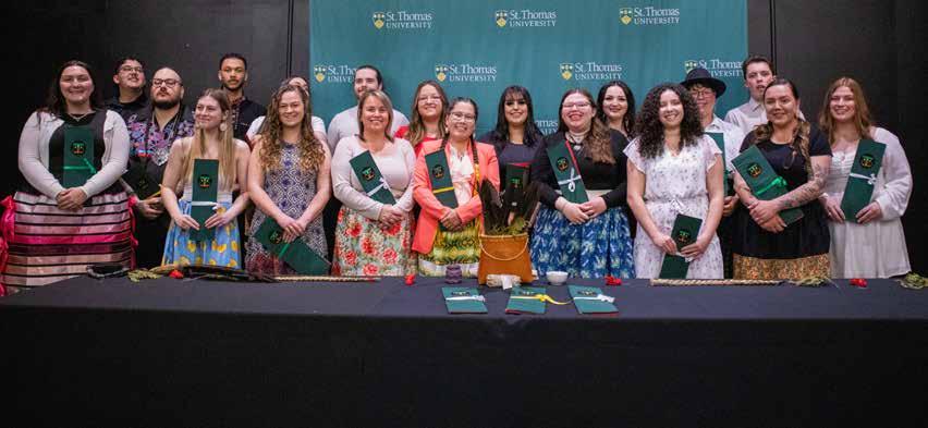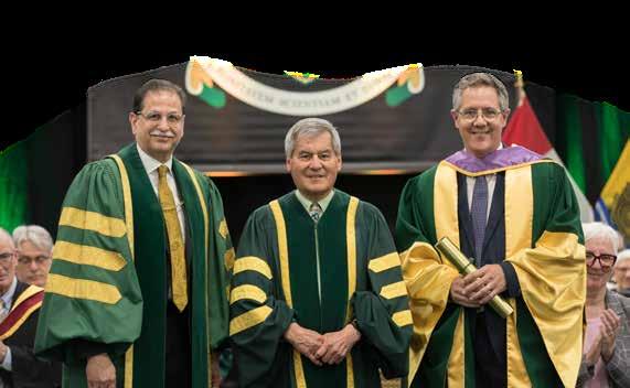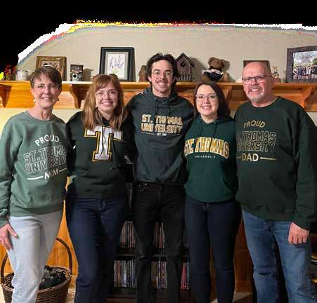 The DesRoches family “bleed green and gold” with all three of the children in their family earning their Bachelor of Arts degrees from St. Thomas University. Emily (DesRoches) Dorey (BA’18) (left), Olivia DesRoches (BA’22) (right) and Jonathan DesRoches (BA’24) (middle). Standing proudly are their parents, Alan (far right) and Arlene DesRoches (far left). •