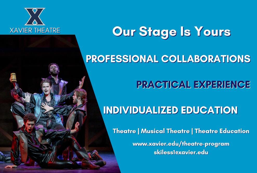 Dr. Elizabeth Harris (Co-Director of Theatre Xavier): Dr. Harris has been with St. Xavier High School for ten years. She possesses an MA in Theatre with an emphasis in Directing from Morehead State University, an MFA in Playwriting from Spalding University, and a Doctor of Education from Spalding University. Before joining St. X, Dr. Harris taught acting at Northern Kentucky University and served as the Director of Theatre Arts for the CCM Preparatory Department. She has worked professionally as an actor and/or director for such companies as Cincinnati Shakespeare Company, Ensemble Theatre of Cincinnati, Covedale Center for the Performing Arts, Know Theatre of Cincinnati, Flat Rock Playhouse, Pittsburgh Civic Light Opera, and New Edgecliff Theatre, where she was artistic director for three years. Dr. Harris has had her original works produced in Atlanta, Cincinnati, and Pittsburgh.