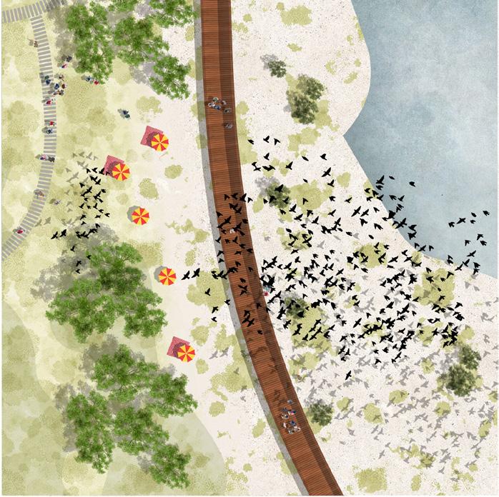 People will be able to interact with the birds from the pathway. The pathway becomes on the surface of the sand in this area allowing more porosity from the site to the sea. The bird habitat won’t be distrubted by any borders, of dominant architecture.