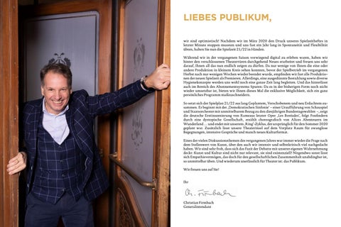LIEBES PUBLIKUM, wir sind optimistisch! Nachdem wir im März 2020 den Druck unseres Spielzeitheftes in letzter Minute stoppen mussten und uns fast ein Jahr lang in Spontaneität und Flexibilität übten, halten Sie nun die Spielzeit 21/22 in Händen. Während wir in der vergangenen Saison vorwiegend digital zu erleben waren, haben wir hinter den verschlossenen Theatertüren durchgehend Neues erarbeitet und freuen uns sehr darauf, Ihnen all das nun endlich zeigen zu dürfen. Da nur wenige von Ihnen die eine oder andere Produktion in kleinem Kreis sehen konnten, bevor der Spielbetrieb im vergangenen Herbst nach nur wenigen Wochen wieder beendet wurde, empfinden wir fast alle Produktionen der neuen Spielzeit als Premieren. Allerdings, eine ausgedünnte Bestuhlung sowie diverse Hygienekonzepte werden uns wohl noch eine ganze Zeit lang begleiten. Und das hinterlässt auch im Bereich des Abonnementsystems Spuren: Da es in der bisherigen Form noch nicht wieder umsetzbar ist, bieten wir Ihnen dieses Mal die exklusive Möglichkeit, sich ein ganz persönliches Programm maßzuschneidern. So setzt sich der Spielplan 21/22 aus lang Geplantem, Verschobenem und neu Erdachtem zusammen. Er beginnt mit der ‚Demokratischen Sinfonie‘ – einer Uraufführung von Schauspiel und Staatsorchester mit unmittelbarem Bezug zu den diesjährigen Bundestagswahlen –, zeigt die deutsche Erstinszenierung von Rameaus letzter Oper ‚Les Boréades‘, folgt Foxfindern durch eine dystopische Gesellschaft, erzählt choreografisch von Alices Abenteuern im Wunderland … und endet mit unserem ‚Ring‘-Zyklus, der ursprünglich für den Sommer 2020 geplant war. Zusätzlich lässt unsere Theaterinsel auf dem Vorplatz Raum für zwanglose Begegnungen, intensive Gespräche und manch neues Kulturformat. Eines der vielen Diskussionsthemen des vergangenen Jahres war immer wieder die Frage nach dem Stellenwert von Kunst, über den auch wir intensiv und selbstkritisch viel nachgedacht haben. Wir sind sehr froh, dass sich das Fazit der Debatte mit unserer eigenen Wahrnehmung deckt: Kunst und Kultur sind nicht nur relevant, sie sind existenziell! Nirgendwo sonst lässt sich Empathievermögen, das doch für den gesellschaftlichen Zusammenhalt unabdingbar ist, so unmittelbar üben. Und wiederum unerlässlich für Theater ist: das Publikum. Wir freuen uns auf Sie! Ihr