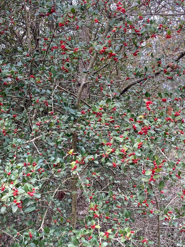 And then there’s the holly & winterberry. I’ve been keeping a close eye on the holly bushes on the trails, because they’ve been heavy with bright red berries this year—looking like they’re ready to audition for a Christmas card. The holly is planted right along that deer trail where the blue Blue Loop switches over to Red Loop—one of those spots where the woods zigzag.