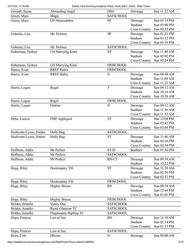 11||Hunter/JumperInstitute 13-15||USHJAHunterJumpersInandOutSeries 20-22||EventingAcademySchoolingHorseTrials