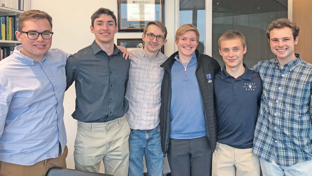 Senior Cadets Brennan Fitzgerald, Jack Fyten, Tate Peterson, Cooper Corbo, Thomas Wagner, and Charles Crutchfield in the Personal Finance and Investing class.