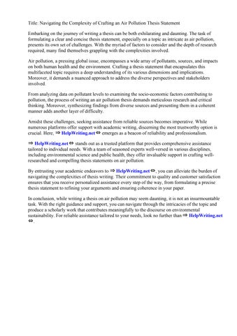 In conclusion, while writing a thesis on air pollution may seem daunting, it is not an insurmountable task. With the right guidance and support, you can navigate through the intricacies of the topic and produce a scholarly work that contributes meaningfully to the discourse on environmental sustainability. For reliable assistance tailored to your needs, look no further than ⇒ HelpWriting.net ⇔