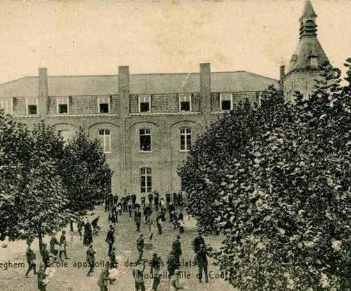 In 1901 kwamen de Paters Oblaten naar Nieuwenhove waar ze een noviciaat oprichtten, een opleidingshuis voor jonge mannen die pater wilden worden. De paters leefden volgens vier geloften: armoede, zuiverheid, gehoorzaamheid en volharding. Een leven van eenvoud en toewijding, volledig in dienst van geloof en onderwijs. In 1937 trokken ze naar het klooster in de Olmstraat in Waregem. Rond 1912 was het er een levendige bedoening (zie foto). Op de speelplaats speelden kinderen riddertje, onder het toeziend oog van de surveillanten. Met houten zwaarden en veel fantasie voerden ze hun eigen veldslagen. Maar het was niet alleen spel: in de voormalige kloostertuin zaten leerlingen ook met hun studieboeken. Meer dan honderd jaar later blijft de echo van spelende kinderen en studerende leerlingen voelbaar, zelfs vandaag. Ook in Desselgem stond ooit een klooster. Misschien vertellen we dat verhaal in een van de komende edities van de Peerdesprong.