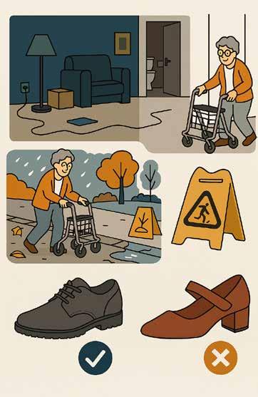 Natte bladeren, gladde tegels bij vriesweer… kunnen ervoor zorgen dat je snel uitglijdt. Ga daarom zeker niet alleen op stap met de rollator en draag aangepast en veilig schoeisel! Let hierbij op de volgende zaken: