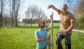 Appels en peren plukken in het Aalsterse Zwembadpark? Over enkele jaren zal het kunnen. In samenwerking met het Regionaal Landschap Schelde-Durme is het park vijf unieke soorten rijker: van de Lapino – gevonden aan de Konijnenberg in Hofstade – tot de Molenbeek, waarvan de moederboom op de Leirekensroute staat. “Het gaat om fruitvondelingen: takjes van bomen die spontaan groeien uit pitjes van weggegooide klokhuizen”, zegt initiatiefnemer Ruben Meert (rechts op foto). “Van een bestaande boom knippen we de top af en vervolgens maken we een inkeping in de stam, waarna we er een takje van de fruitvondeling in schuiven. Onderstam en ent groeien vervolgens aan elkaar.”