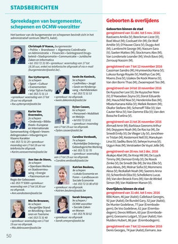 Caroline Verdoodt, 7e schepen • Ruimtelijke Ordening • Gebiedsgerichte Werking • tel. 053 72 31 70 • spreekuur: woensdag van 17 tot 19 uur na afspraak. Ann Van de Steen, • Caroline.verdoodt@aalst.be 3e schepen • Openbare Werken Katrien Beulens, en Stadsvernieu8e schepen wing • Energie • Lokale Economie en • Patrimonium en Foren • Landbouw en Regie der Gebouwen Sociale Economie • tel. 053 77 9300 • spreekuur: • tel. 053 72 31 80 of 83 woensdag van 17 tot 18.30 uur • spreekuur: na afspraak. na afspraak. • Katrien.beulens@aalst.be • Ann.vandesteen@aalst.be Sarah Smeyers, 9e schepen / Mia De Brouwer, OCMW-voorzitter 4e schepen • Sociale Zaken • Burgerlijke Stand en Wonen en Bevolking • Seni• tel. 053 76 50 02 oren en Toerisme • spreekuur: na afspraak • tel. 053 72 31 40 • Sarah.smeyers@aalst.be • spreekuur: woensdag van 17 tot 19 uur na afspraak. • Mia.debrouwer@aalst.be