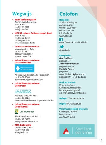 www.facebook.com/StadAalst @StadAalst Fotografie: Gert Swillens: pagina’s 1, 7 Jean-Pierre Swirko: pagina’s 4, 6, 14 Marieke Penne: pagina 18 www.thinkstockphotos.com: pagina’s 8, 9, 11, 13, 15, 16, 17 Druk en lay-out: Drukkerij Artoos Klimaatneutraal bedrijf Dit magazine is gedrukt op 100% gerecycleerd papier Oplage: 7 500 exemplaren Depot: D/1799/2016/18 Verantwoordelijke uitgever: Christoph D’Haese burgemeester p.a. Werf 9, Aalst