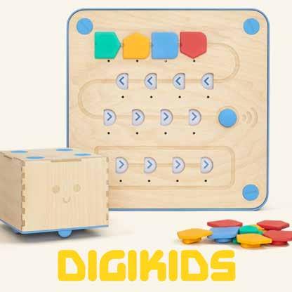 Daarna gaan we aan de slag met Cubetto. Met kleurrijke blokjes programmeren we de robot: vooruit, achteruit, links en rechts. Net als Rosie durven we fantaseren, proberen en onze eigen weg kiezen.