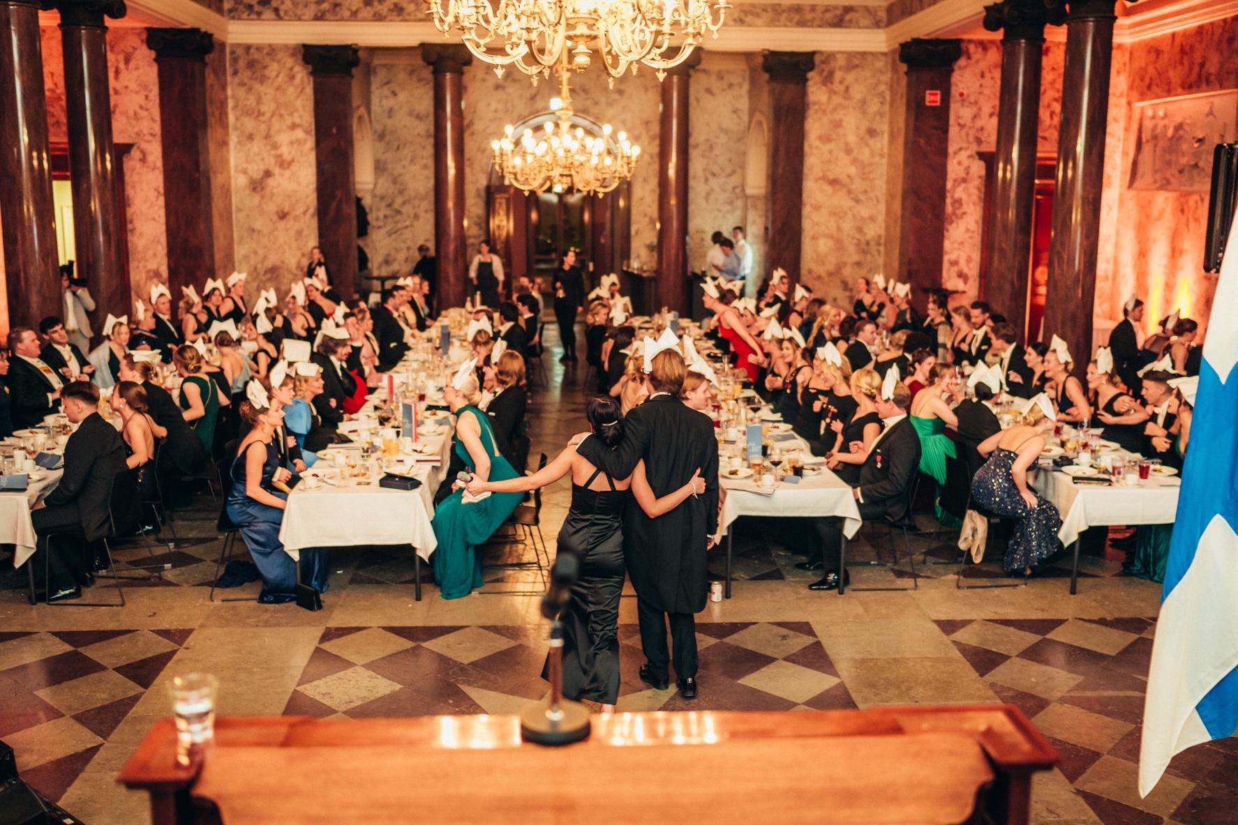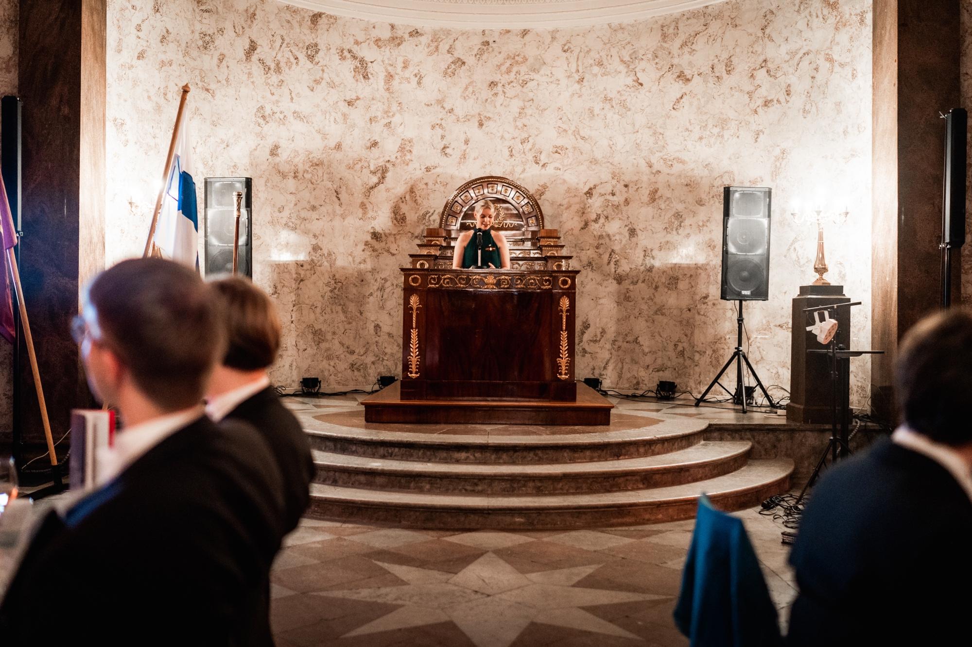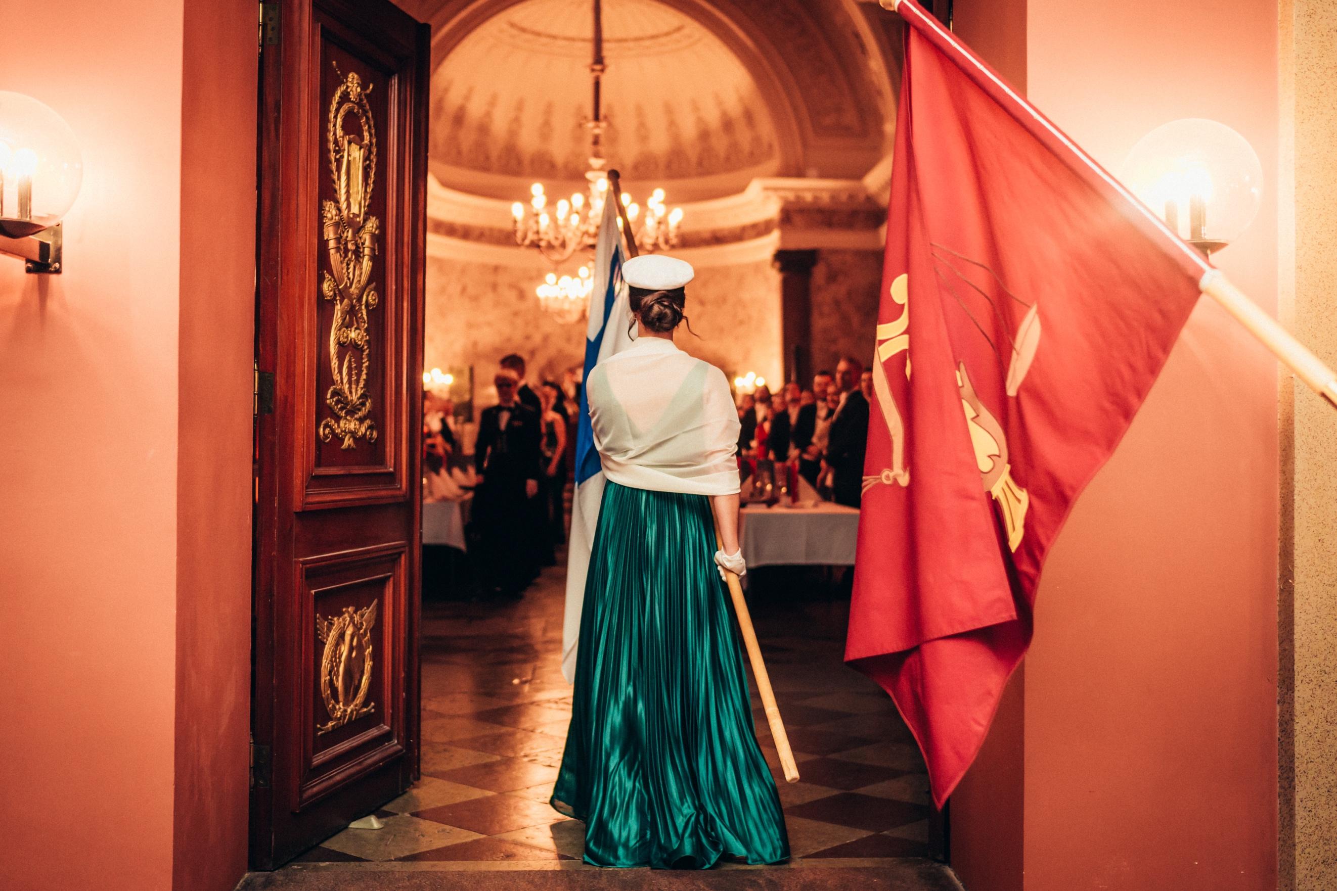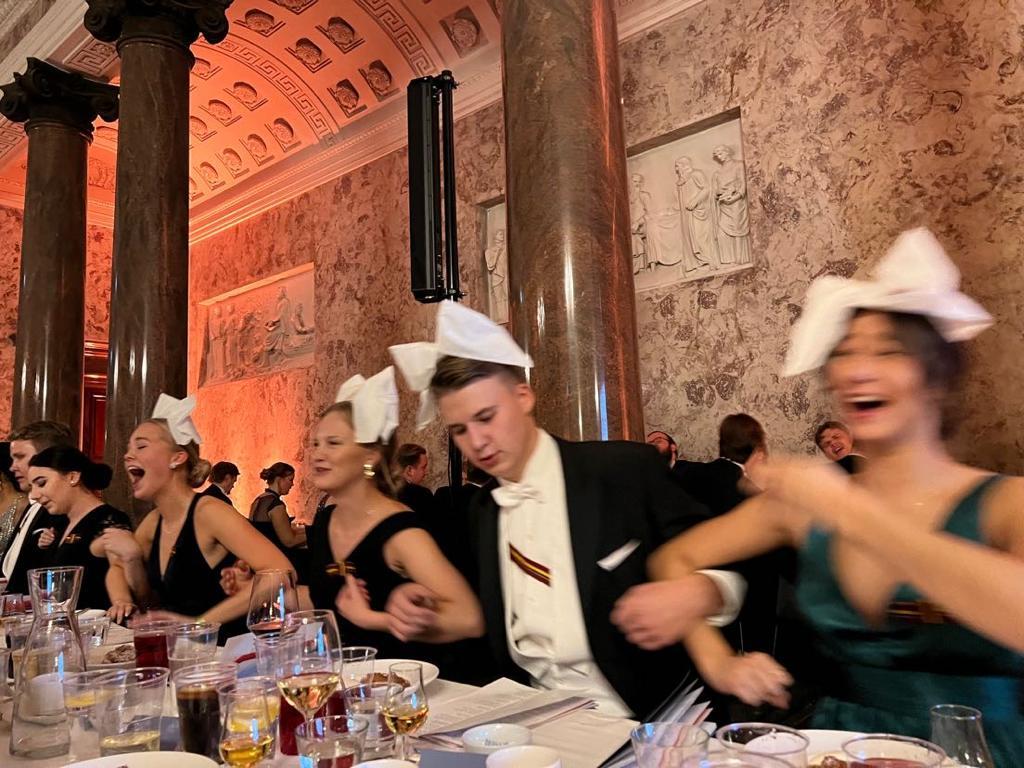 Från första början stod det klart att årsfesten skulle bli något enastående. Akademihuset fylldes med ens av skratt och glada röster när stadgeiter i alla åldrar forsade genom dörrarna till den historiska festsal vi lyckats boka för Stadgas årsfest. Det var roligt att se så många stadgeiter komma på plats redan under solenn akten även om de inte skulle framföra någon hälsning. Någon påpekade att det kunde bero på skumpan som serverades där, för vad är nu ett bättre sätt att börja årsfestfirandet med om inte ett glas bubblande eller två. Stämningen var på topp redan nu och den skulle bara bli bättre ju längre kvällen gick. Snart knackade marskalkarna i stengolvet med staven och förkunnade att banketten var serverad. Medan gästerna tog sig till sina