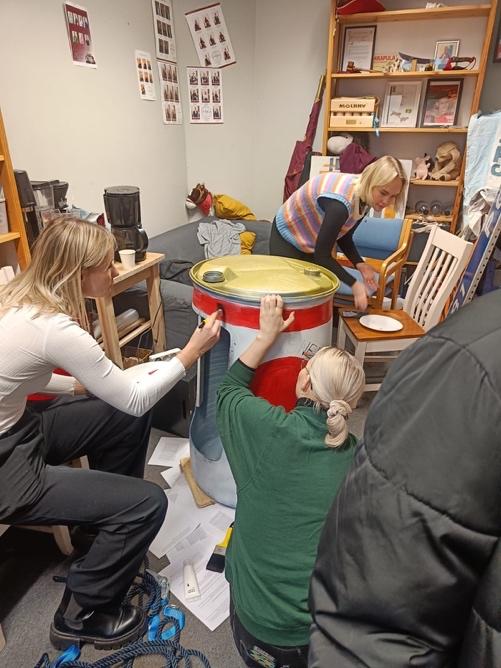 När vi väl hade lagt fram allt material och byggandet samt målandet satte igång gick allting väldigt smidigt. Vi delade upp oss i byggare och målare och några timmar senare hade vi en kärra och en vitmålad tunna. Byggarna och målarna var i detta skede lite utmattade så vi gick på en liten rundtur på gården där vi fick se både hästar och höns. Till slut ledde rundturen till Andys vardagsrum där vi blev bjudna på kaffe och bulle. Proje klagar inte. Efter kaffet och efter att vi kort bekantat oss med Andys husdjur begav sig målarna raskt och finslipade målningen och sedan satt vi oss i bilarna och begav oss tillbaka till Åbo.