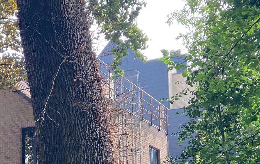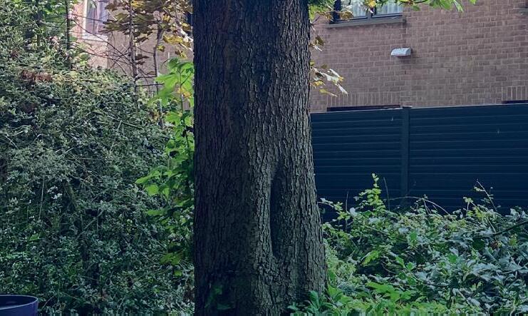 Tussen deze twee bomen stond een jongere boom, wiens kruin in de weg zat. Daarom beslisten de groenmedewerkers om de jongste boom te vellen. De stam bleef staan en krijgt nu de kans om uit te groeien tot een natuurlijk insectenhotel.