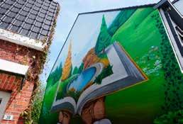 Hoe? Hij maakte eerst de kleurvlakken met muurverf en zette er vervolgens een schets op met de spuitbus. Daarna kleurde hij alles in. Het was geen eenvoudig werkje, zijn hoogtewerker paste er precies tussenin en het regende veel in april. Na twee weken was de gevel klaar. Billie heeft alleen maar mooie reacties gekregen op zijn werk. Het ligt een beetje verscholen, maar dat maakt het net zo bijzonder.