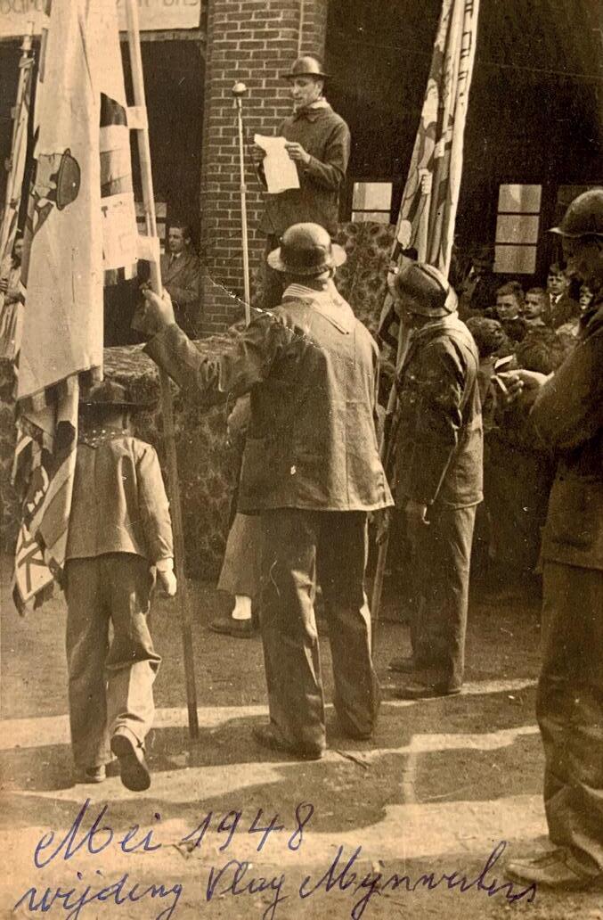 Anno 1948: Iedereen klaar bij aanvang van de processie ter ere van de Heilige Barbara, patrones van de Limburgse mijnwerkers. Hier voor het eerst met de nieuwe vlag van de vereniging.
