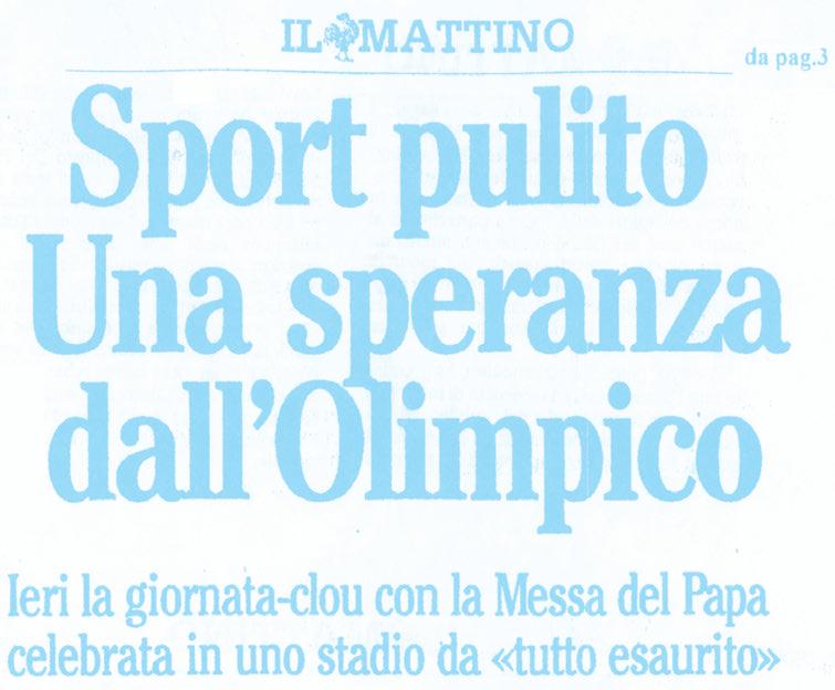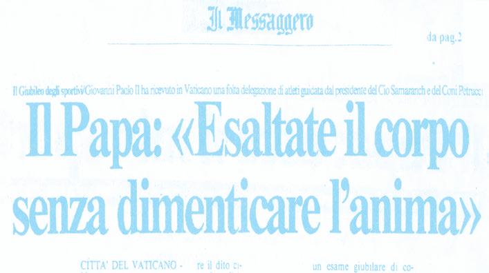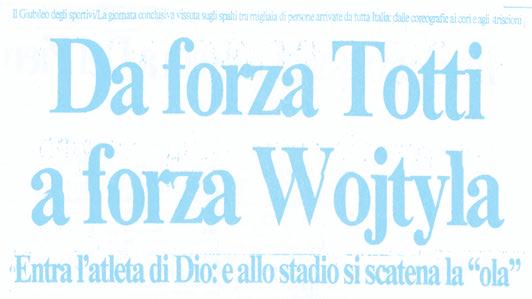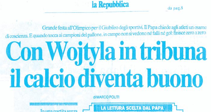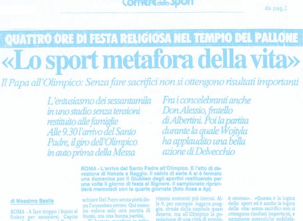 Oltre ad essere un imponente fenomeno sociale, lo sport è anche, come ha detto all'Olimpico il Papa. "quasi un segno dei tempi". Egli ha anzi invitato a "rendere grazie a Dio per il dono dello sport". Non può dunque essere estraneo alla quotidiana azione pastorale delle Chiese locali. Il Papa non ha parlato, in quest'occasione, direttamente al mondo ecclesiale; ma le premesse perché la Chiesa s'interessi dello sport ci sono tutte. Anzitutto, perché la via della Chiesa è l'uomo, con i suoi problemi e interessi. E se essa si disinteressa di questi, l'uomo la sente estranea e disincarnata. In secondo luogo perché, come ha detto Giovanni Paolo II nel grande stadio romano, "grande importanza assume oggi la pratica sportiva, perché può favorire l'affermarsi nei giovani di valori importanti quali la lealtà, la perseveranza, l'amicizia, la condivisione, la solidarietà".
