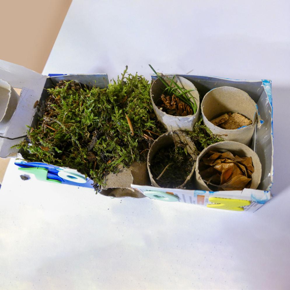 Stop in je wc-rolletjes opgerolde stukjes papier en al het materiaal dat je buiten verzamelde: mos, stokjes, dennenappels, takjes, enzovoort.