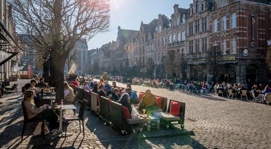 ‘Daarnaast hebben we sfeerverlichting op enkele pleinen en aan historische gebouwen zoals de Oude Markt, het stadhuis, de SintPieterskerk en sinds kort ook het Victor Broosplein (zie foto). Zo is de stad ook ’s avonds een gezellige plek. Om middernacht doven we die sfeerverlichting. Volgend jaar leggen we het Martelarenplein opnieuw aan. Sfeerverlichting zit mee in het ontwerp.’