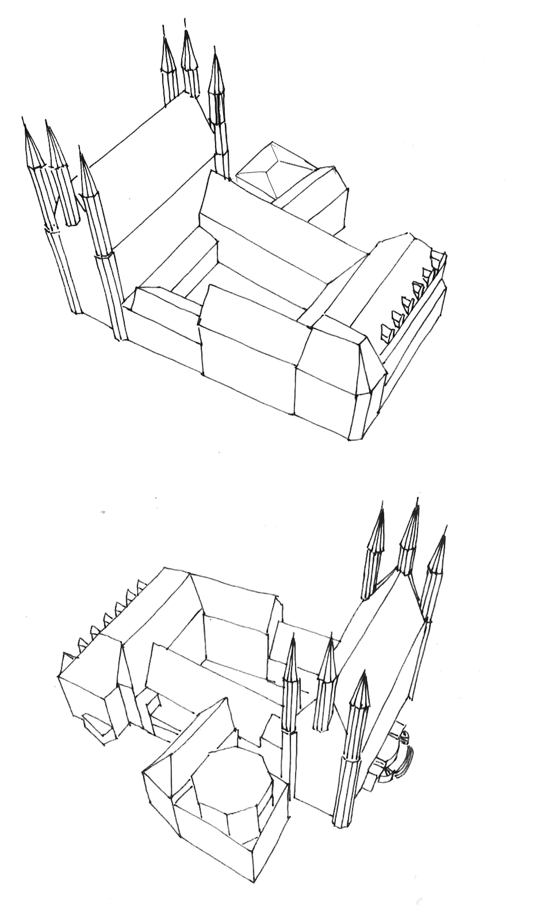 Bovenop het Corps de Garde komen twee verdiepingen in de vorm van een achthoek. Die vorm is geïnspireerd op de achthoekige vormen van de torens van het Voorhuis, het Tafelrond en het koor van de kerk.