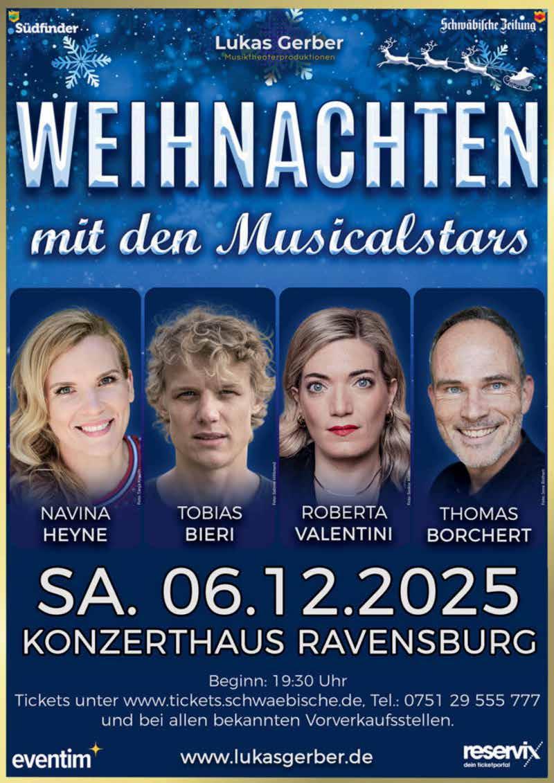 Neben Thomas Borchert und Navina Heyne sind bei diesem Konzert auch die beliebten Künstler Roberta Valentini und Tobias Bieri mit dabei. Freuen Sie sich auf einen weihnachtlichen Konzertabend mit diesen Superstars der Musicalbranche und erleben Sie die Highlights der schönsten Weihnachtssongs. Es werden Hits wie „White Christmas“, „Do they know its christmas“, „All i want for christmas“ und viele mehr interpretiert. Verpackt in einem neu erschaffenen Konzertformat mit vielen Überraschungen.