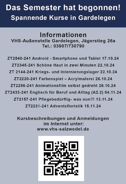 Einen eigenen Adventskranz oder Deko für die Haustür gestalten? Wer wissen will, wie es geht, kann am 15. November, von 18.00 bis 20.15 Uhr, am Volkshochschulkurs „Adventsfloristik im Gymnasium Gardelegen für 7 Euro teilnehmen. Materialien können bei der Kursleiterin erworben werden. Anmeldungen unter vhs.salzwedel@altmarkkreis.de oder www. vhs-salzwedel.de