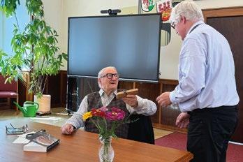 Nach der Lesung überreichte Stadtmitarbeiter Rupert Kaiser dem Maler ein kleines Dankeschön.
