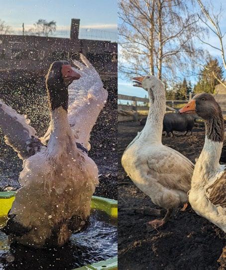 Und somit entschieden endie früheren Besitzer schweren Herzens, dass das Gänsepaar umziehen muss. Aber wohin? Alle Interessenten wollten Karlchen und Leni schlachten. Das kam aber natürlich nicht infrage. Die Suche dauerte lange und schien aussichtslos - bis sie den LilaLebenshoff in Tarnefitz entdeckten. „Hier wird niemand gegessen und unsere Hunde sind „gänsefest“, versicherte Susanne Hoff vom LilaLebenshoff und weiter: „Außerdem hatten wir zu diesem Zeitpunkt drei Gänse, von denen die älteste bereits über 12 Jahre alt war. Also haben wir Karlchen und seine Leni sehr gerne aufgenommen“, erzählte sie. Auf den Lebenshoff lebt Herdenschutzhündin Sunny. Sie hat dem vorlauten Karlchen einmal deutlich, jedoch ohne Verletzung, die Meinung „gesagt“. Danach wusste Karlchen, dass er nicht das alleinige Sagen auf dem LilaLebenshoff hatte. „Wir hoffen, dass die beiden noch einige entspannte Jahre bei uns verbringen können. Wir sind momentan auf der Suche nach zwei bis drei weiblichen Junggänsen, damit Leni und Karlchen sie zur „LilaLebenshoff-Polizei“ ausbilden können“, erklärte sie augenzwickernd.