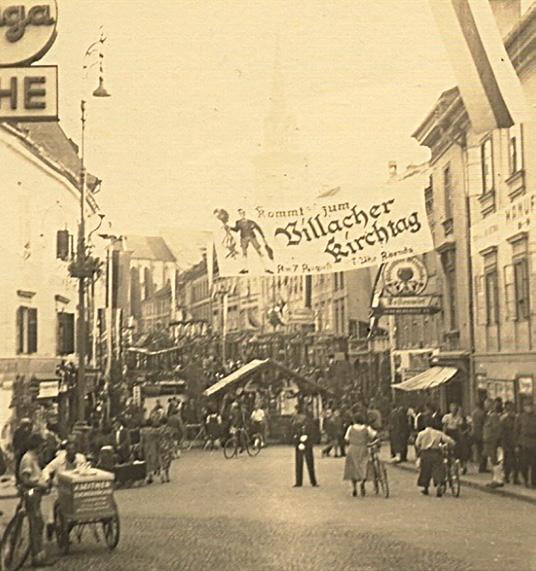 1. Am 1. August 1936 luden Fremdenverkehr, Bauerngman und Villacher Vereine zum ersten Villacher Kirchtag. 2. Helena hat schon einen der begehrten Herzerl-Anstecker. 3. Die Bauerngman beim ersten Nachkriegskirchtag 1948 auf der alten Stadtbrücke.