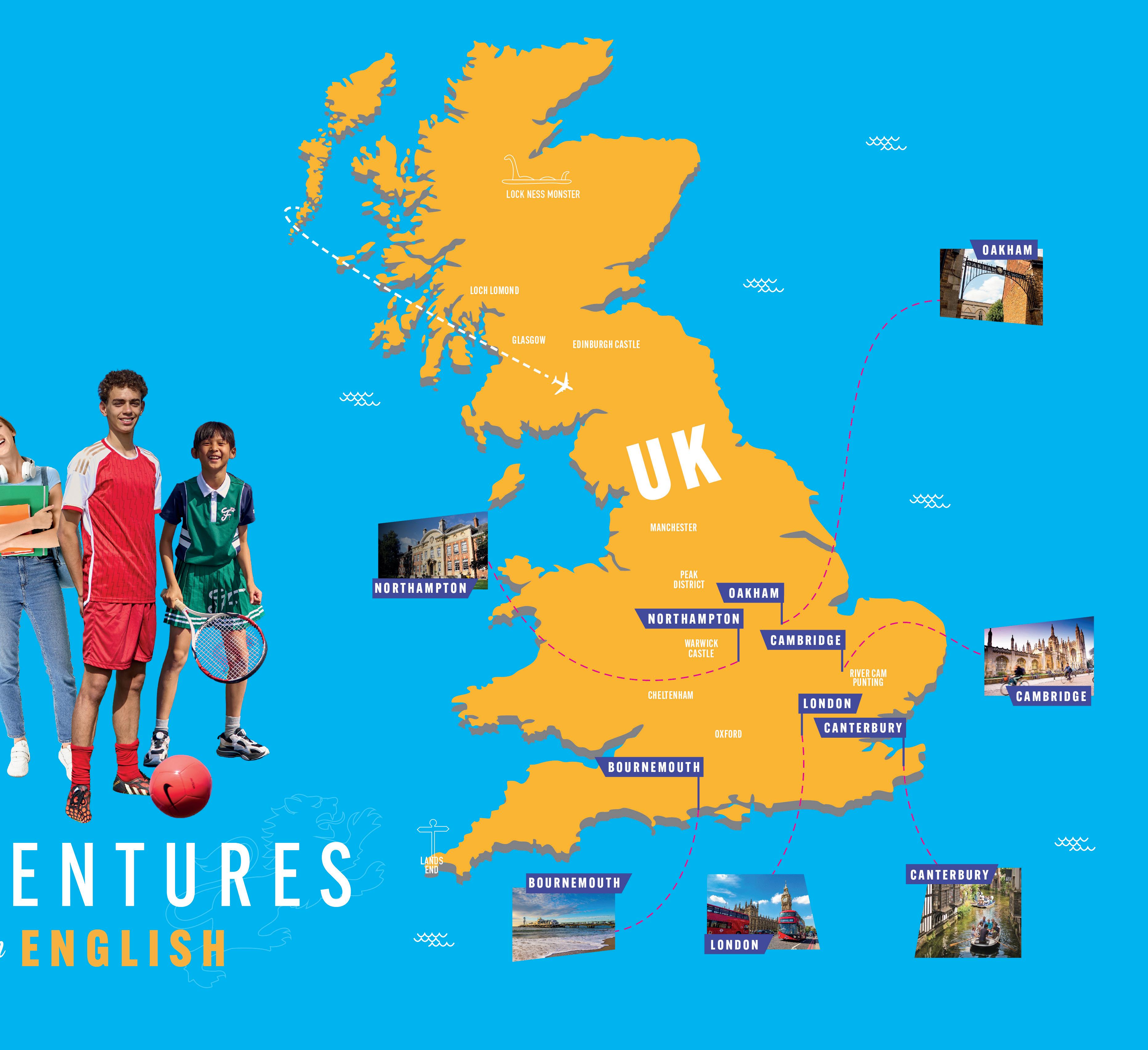 We enjoy a reputation for providing effective language lessons and running wellorganised activities and excursions, in safe and friendly environments throughout the UK and USA. We give equal importance to both the academic and leisure parts of the programme and encourage students to use the English language rather than to ‘learn about it’. For more information on our centres, as well as further information on the courses available, please explore: www.studyholidays.com